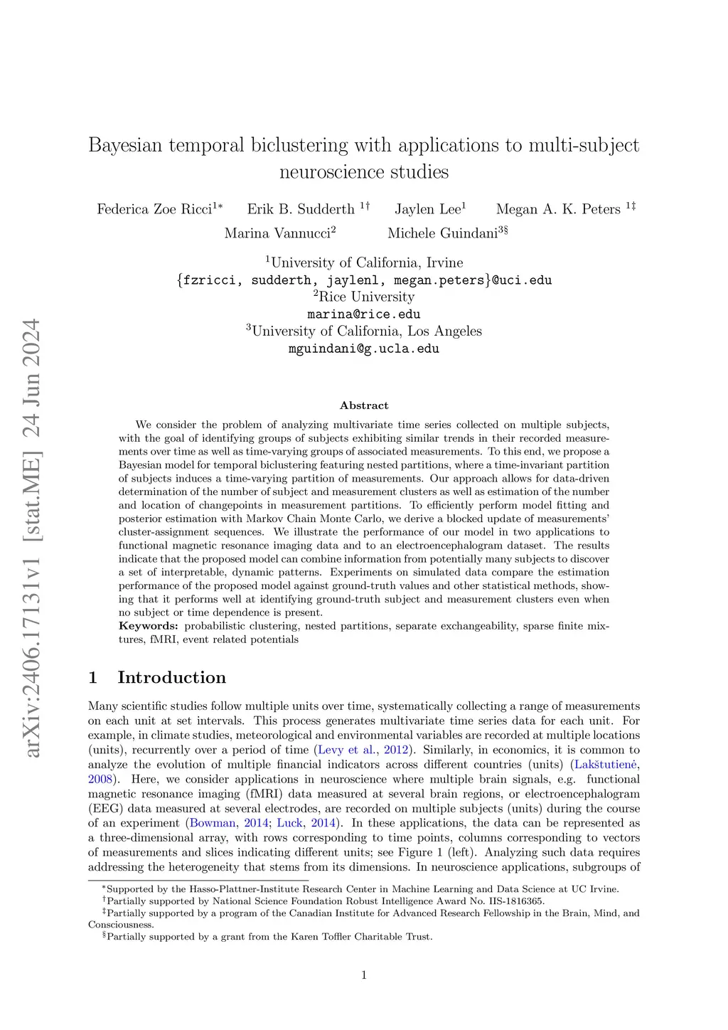 We consider the problem of analyzing multivariate time series collected on multiple subjects, with the goal of identifying groups of subjects exhibiting similar trends in their recorded measurements over time as well as time-varying groups of associated measurements. To this end, we propose a Bayesian model for temporal biclustering featuring nested partitions, where a time-invariant partition of subjects induces a time-varying partition of measurements. Our approach allows for data-driven determination of the number of subject and measurement clusters as well as estimation of the number and location of changepoints in measurement partitions. To efficiently perform model fitting and posterior estimation with Markov Chain Monte Carlo, we derive a blocked update of measurements' cluster-assignment sequences. We illustrate the performance of our model in two applications to functional magnetic resonance imaging data and to an electroencephalogram dataset. The results indicate that the proposed model can combine information from potentially many subjects to discover a set of interpretable, dynamic patterns. Experiments on simulated data compare the estimation performance of the proposed model against ground-truth values and other statistical methods, showing that it performs well at identifying ground-truth subject and measurement clusters even when no subject or time dependence is present.
