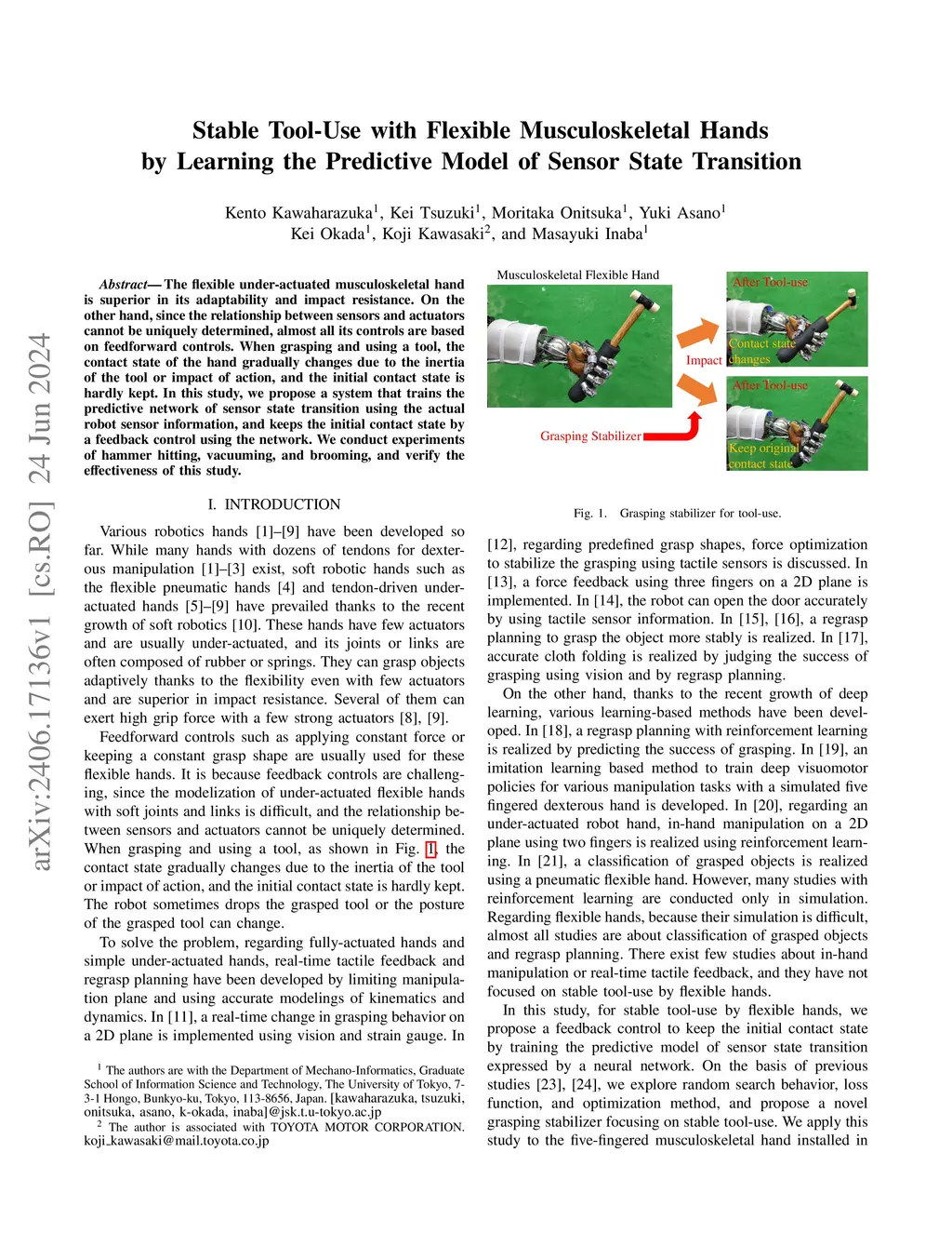 The flexible under-actuated musculoskeletal hand is superior in its adaptability and impact resistance. On the other hand, since the relationship between sensors and actuators cannot be uniquely determined, almost all its controls are based on feedforward controls. When grasping and using a tool, the contact state of the hand gradually changes due to the inertia of the tool or impact of action, and the initial contact state is hardly kept. In this study, we propose a system that trains the predictive network of sensor state transition using the actual robot sensor information, and keeps the initial contact state by a feedback control using the network. We conduct experiments of hammer hitting, vacuuming, and brooming, and verify the effectiveness of this study.