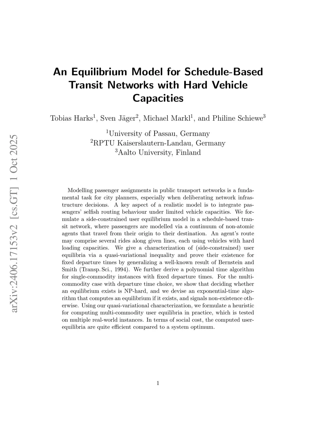 Modelling passenger assignments in public transport networks is a fundamental task for city planners, especially when deliberating network infrastructure decisions. A key aspect of a realistic model is to integrate passengers' selfish routing behaviour under limited vehicle capacities. We formulate a side-constrained user equilibrium model in a schedule-based transit network, where passengers are modelled via a continuum of non-atomic agents that travel from their origin to their destination. An agent's route may comprise several rides along given lines, each using vehicles with hard loading capacities. We give a characterization of (side-constrained) user equilibria via a quasi-variational inequality and prove their existence for fixed departure times by generalizing a well-known result of Bernstein and Smith (Transp. Sci., 1994). We further derive a polynomial time algorithm for single-commodity instances with fixed departure times. For the multi-commodity case with departure time choice, we show that deciding whether an equilibrium exists is NP-hard, and we devise an exponential-time algorithm that computes an equilibrium if it exists, and signals non-existence otherwise. Using our quasi-variational characterization, we formulate a heuristic for computing multi-commodity user equilibria in practice, which is tested on multiple real-world instances. In terms of social cost, the computed user-equilibria are quite efficient compared to a system optimum.