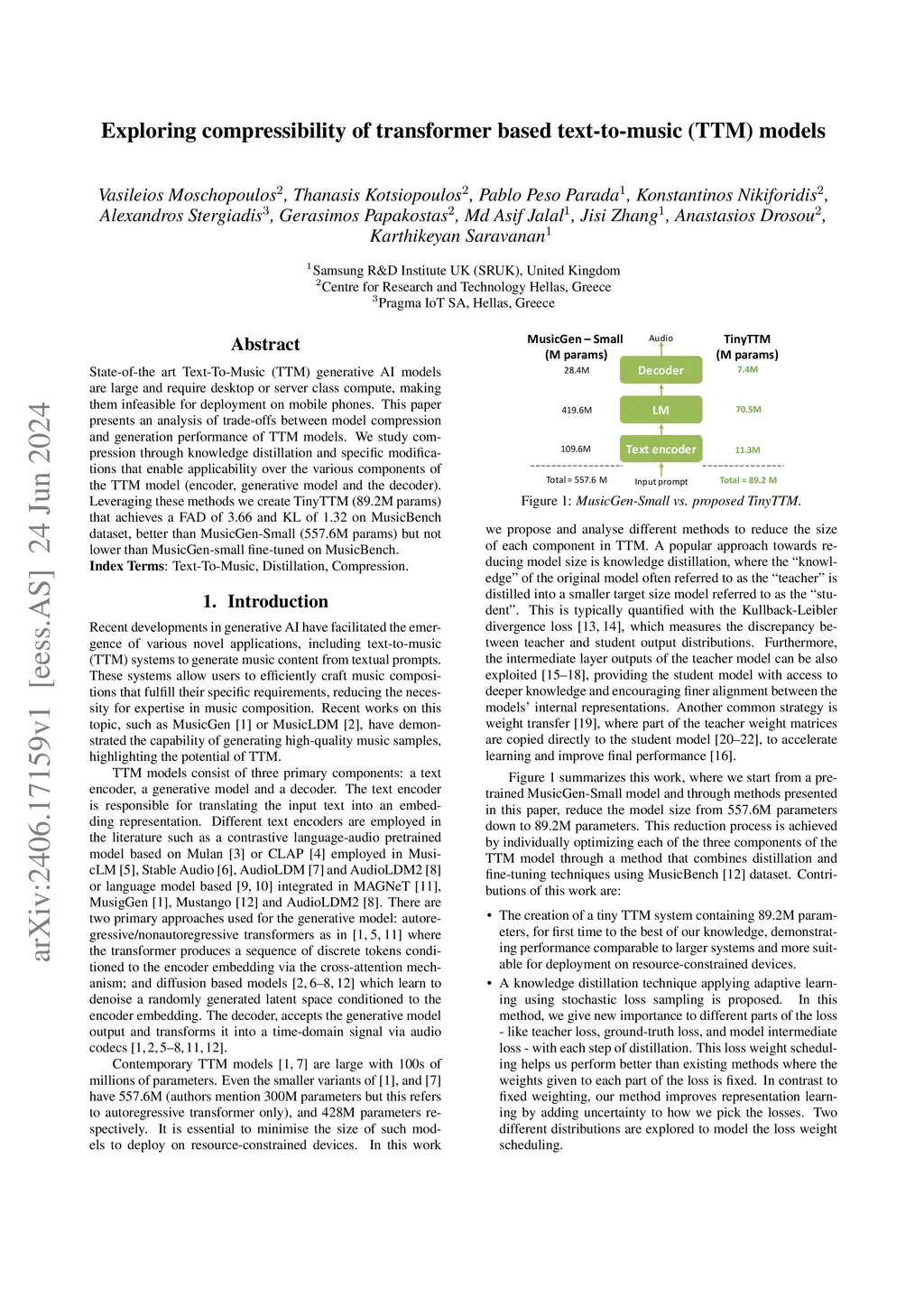 State-of-the art Text-To-Music (TTM) generative AI models are large and require desktop or server class compute, making them infeasible for deployment on mobile phones. This paper presents an analysis of trade-offs between model compression and generation performance of TTM models. We study compression through knowledge distillation and specific modifications that enable applicability over the various components of the TTM model (encoder, generative model and the decoder). Leveraging these methods we create TinyTTM (89.2M params) that achieves a FAD of 3.66 and KL of 1.32 on MusicBench dataset, better than MusicGen-Small (557.6M params) but not lower than MusicGen-small fine-tuned on MusicBench.
