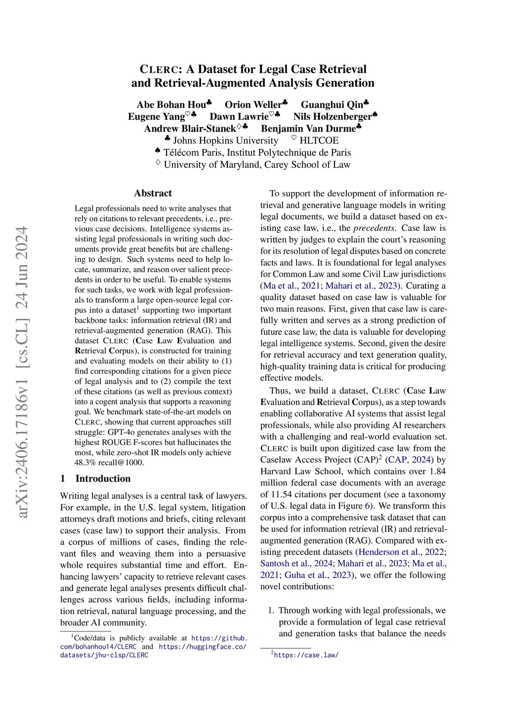 Legal professionals need to write analyses that rely on citations to relevant precedents, i.e., previous case decisions. Intelligent systems assisting legal professionals in writing such documents provide great benefits but are challenging to design. Such systems need to help locate, summarize, and reason over salient precedents in order to be useful. To enable systems for such tasks, we work with legal professionals to transform a large open-source legal corpus into a dataset supporting two important backbone tasks: information retrieval (IR) and retrieval-augmented generation (RAG). This dataset CLERC (Case Law Evaluation Retrieval Corpus), is constructed for training and evaluating models on their ability to (1) find corresponding citations for a given piece of legal analysis and to (2) compile the text of these citations (as well as previous context) into a cogent analysis that supports a reasoning goal. We benchmark state-of-the-art models on CLERC, showing that current approaches still struggle: GPT-4o generates analyses with the highest ROUGE F-scores but hallucinates the most, while zero-shot IR models only achieve 48.3% recall@1000.