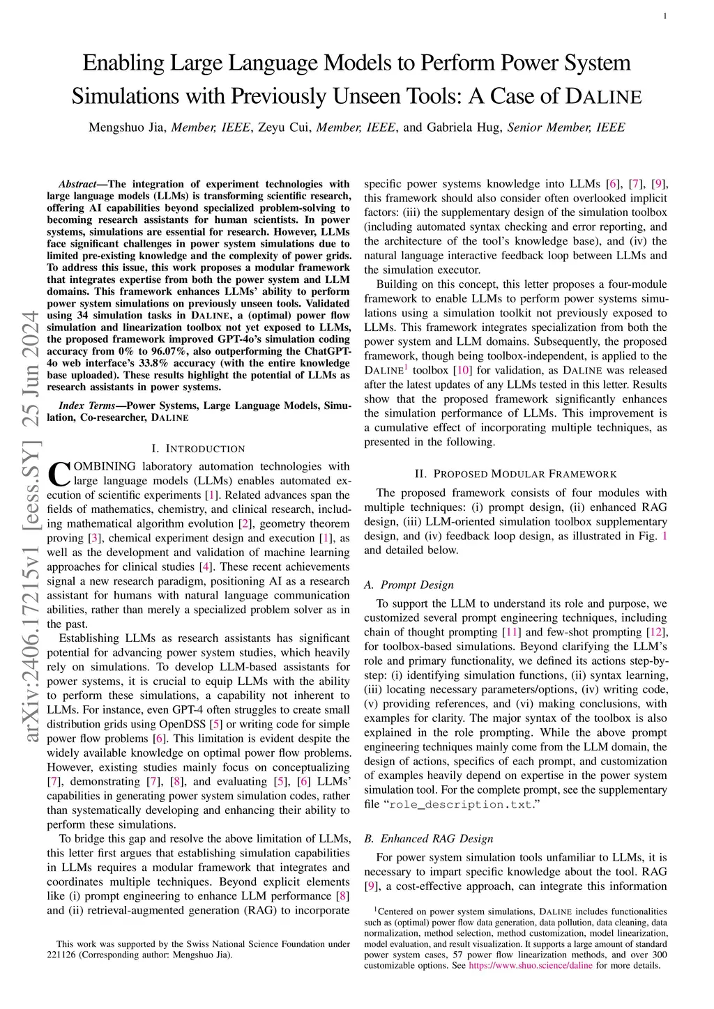 The integration of experiment technologies with large language models (LLMs) is transforming scientific research, offering AI capabilities beyond specialized problem-solving to becoming research assistants for human scientists. In power systems, simulations are essential for research. However, LLMs face significant challenges in power system simulations due to limited pre-existing knowledge and the complexity of power grids. To address this issue, this work proposes a modular framework that integrates expertise from both the power system and LLM domains. This framework enhances LLMs' ability to perform power system simulations on previously unseen tools. Validated using 34 simulation tasks in Daline, a (optimal) power flow simulation and linearization toolbox not yet exposed to LLMs, the proposed framework improved GPT-4o's simulation coding accuracy from 0% to 96.07%, also outperforming the ChatGPT-4o web interface's 33.8% accuracy (with the entire knowledge base uploaded). These results highlight the potential of LLMs as research assistants in power systems.