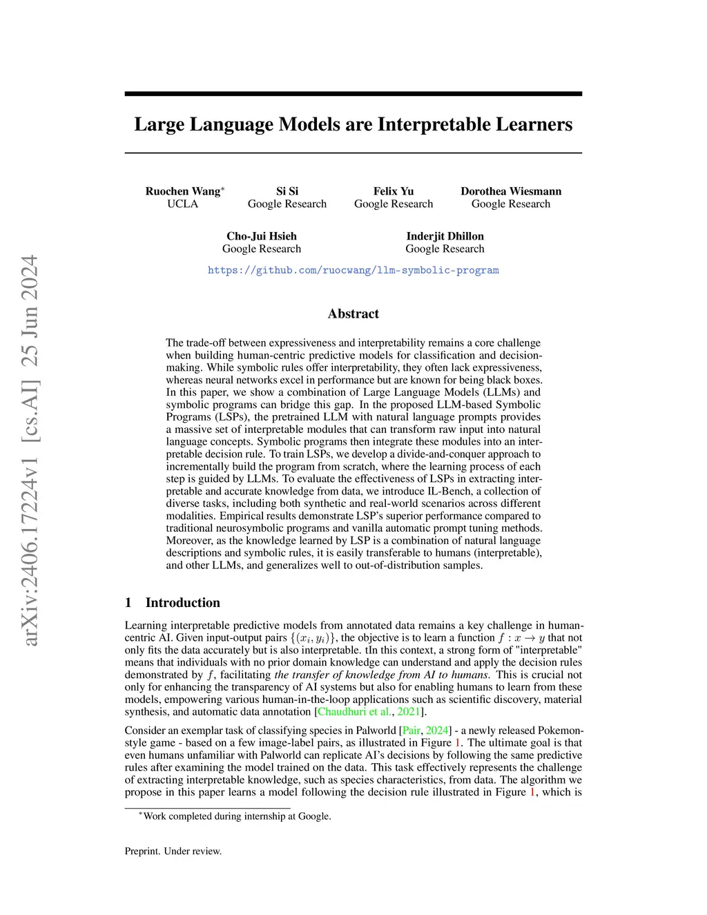 The trade-off between expressiveness and interpretability remains a core challenge when building human-centric predictive models for classification and decision-making. While symbolic rules offer interpretability, they often lack expressiveness, whereas neural networks excel in performance but are known for being black boxes. In this paper, we show a combination of Large Language Models (LLMs) and symbolic programs can bridge this gap. In the proposed LLM-based Symbolic Programs (LSPs), the pretrained LLM with natural language prompts provides a massive set of interpretable modules that can transform raw input into natural language concepts. Symbolic programs then integrate these modules into an interpretable decision rule. To train LSPs, we develop a divide-and-conquer approach to incrementally build the program from scratch, where the learning process of each step is guided by LLMs. To evaluate the effectiveness of LSPs in extracting interpretable and accurate knowledge from data, we introduce IL-Bench, a collection of diverse tasks, including both synthetic and real-world scenarios across different modalities. Empirical results demonstrate LSP's superior performance compared to traditional neurosymbolic programs and vanilla automatic prompt tuning methods. Moreover, as the knowledge learned by LSP is a combination of natural language descriptions and symbolic rules, it is easily transferable to humans (interpretable), and other LLMs, and generalizes well to out-of-distribution samples.