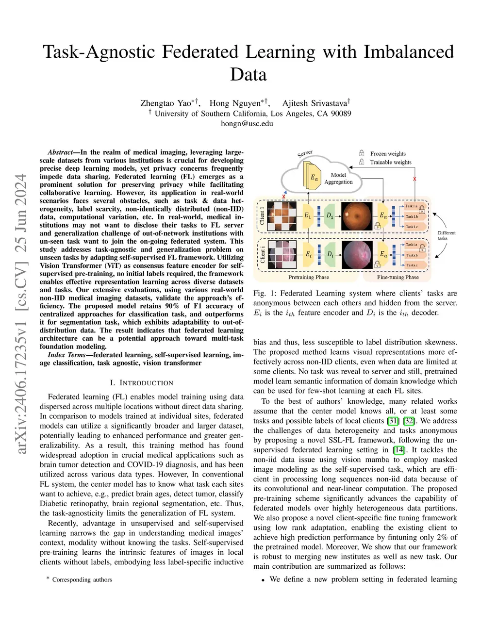 In the realm of medical imaging, leveraging large-scale datasets from various institutions is crucial for developing precise deep learning models, yet privacy concerns frequently impede data sharing. federated learning (FL) emerges as a prominent solution for preserving privacy while facilitating collaborative learning. However, its application in real-world scenarios faces several obstacles, such as task & data heterogeneity, label scarcity, non-identically distributed (non-IID) data, computational vaiation, etc. In real-world, medical institutions may not want to disclose their tasks to FL server and generalization challenge of out-of-network institutions with un-seen task want to join the on-going federated system. This study address task-agnostic and generalization problem on un-seen tasks by adapting self-supervised FL framework. Utilizing Vision Transformer (ViT) as consensus feature encoder for self-supervised pre-training, no initial labels required, the framework enabling effective representation learning across diverse datasets and tasks. Our extensive evaluations, using various real-world non-IID medical imaging datasets, validate our approach's efficacy, retaining 90\% of F1 accuracy with only 5\% of the training data typically required for centralized approaches and exhibiting superior adaptability to out-of-distribution task. The result indicate that federated learning architecture can be a potential approach toward multi-task foundation modeling.