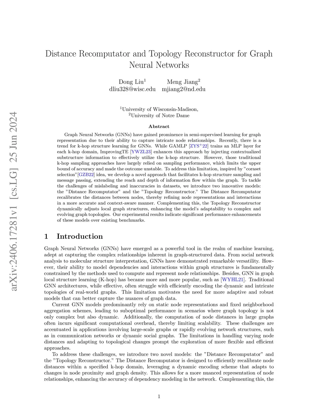 We propose \textbf{DRTR}, a novel graph learning framework that integrates distance-aware multi-hop message passing with dynamic topology refinement. Unlike standard GNNs that rely on shallow, fixed-hop aggregation, DRTR leverages both static preprocessing and dynamic resampling to capture deeper structural dependencies. A \emph{Distance Recomputator} prunes semantically weak edges using adaptive attention, while a \emph{Topology Reconstructor} establishes latent connections among distant but relevant nodes. This joint mechanism enables more expressive and robust representation learning across evolving graph structures. Extensive experiments demonstrate that DRTR outperforms baseline GNNs in both accuracy and scalability, especially in complex and noisy graph environments.