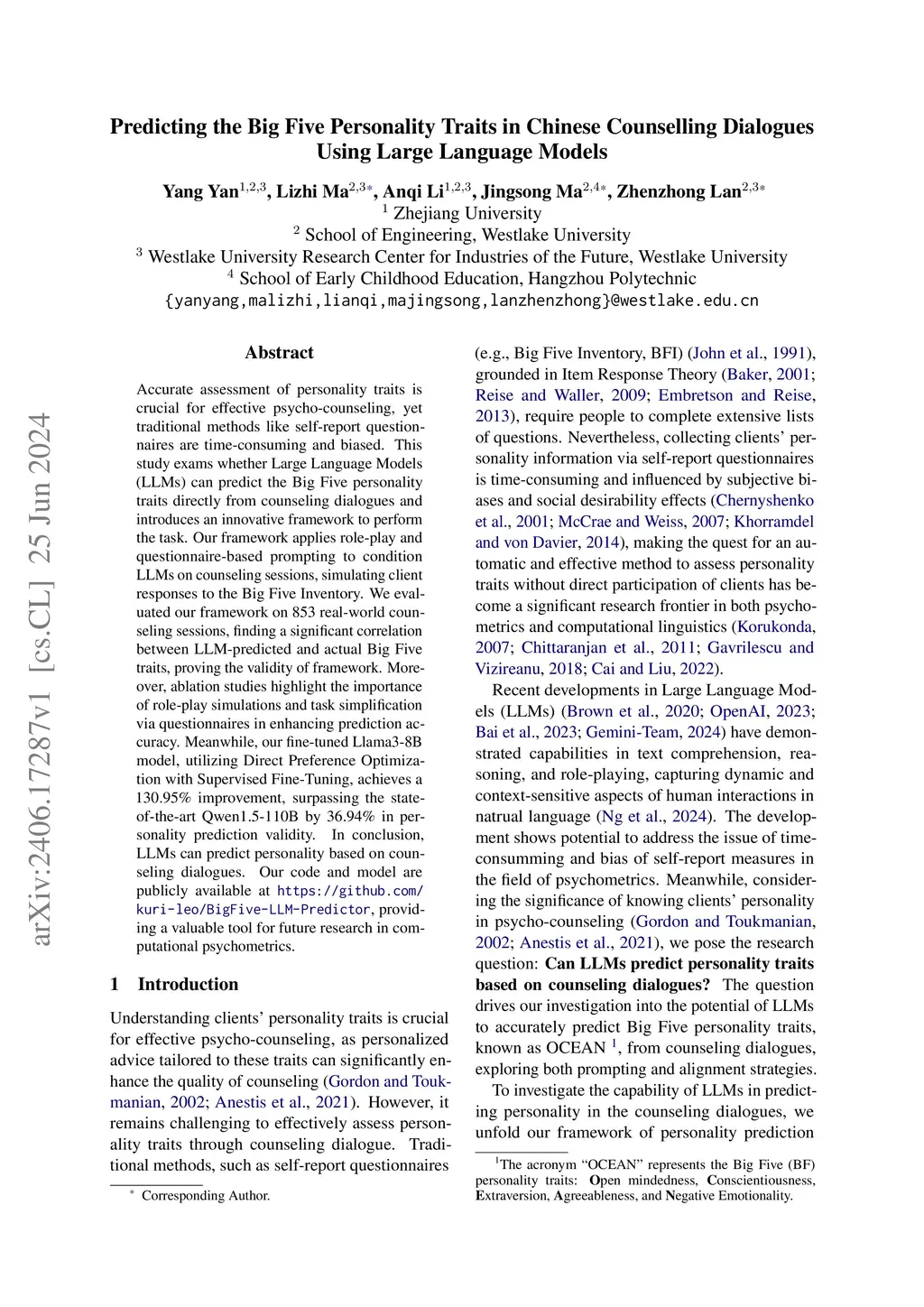 Predicting the Big Five Personality Traits in Chinese Counselling