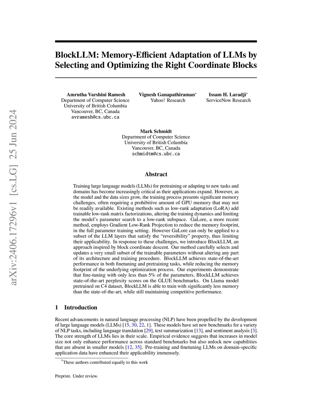 Training large language models (LLMs) for pretraining or adapting to new tasks and domains has become increasingly critical as their applications expand. However, as the model and the data sizes grow, the training process presents significant memory challenges, often requiring a prohibitive amount of GPU memory that may not be readily available. Existing methods such as low-rank adaptation (LoRA) add trainable low-rank matrix factorizations, altering the training dynamics and limiting the model's parameter search to a low-rank subspace. GaLore, a more recent method, employs Gradient Low-Rank Projection to reduce the memory footprint, in the full parameter training setting. However GaLore can only be applied to a subset of the LLM layers that satisfy the "reversibility" property, thus limiting their applicability. In response to these challenges, we introduce BlockLLM, an approach inspired by block coordinate descent. Our method carefully selects and updates a very small subset of the trainable parameters without altering any part of its architecture and training procedure. BlockLLM achieves state-of-the-art performance in both finetuning and pretraining tasks, while reducing the memory footprint of the underlying optimization process. Our experiments demonstrate that fine-tuning with only less than 5% of the parameters, BlockLLM achieves state-of-the-art perplexity scores on the GLUE benchmarks. On Llama model pretrained on C4 dataset, BlockLLM is able to train with significantly less memory than the state-of-the-art, while still maintaining competitive performance.