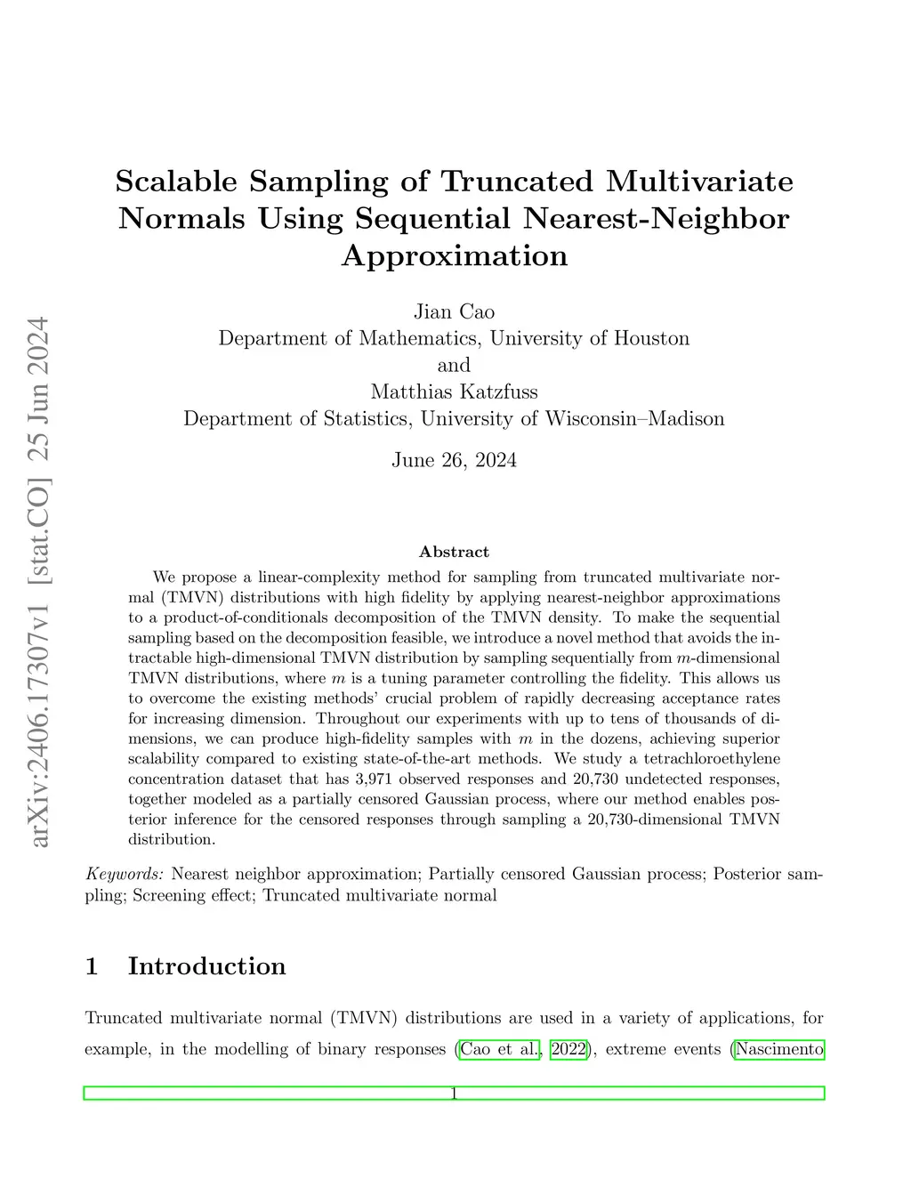 We propose a linear-complexity method for sampling from truncated multivariate normal (TMVN) distributions with high fidelity by applying nearest-neighbor approximations to a product-of-conditionals decomposition of the TMVN density. To make the sequential sampling based on the decomposition feasible, we introduce a novel method that avoids the intractable high-dimensional TMVN distribution by sampling sequentially from -dimensional TMVN distributions, where is a tuning parameter controlling the fidelity. This allows us to overcome the existing methods' crucial problem of rapidly decreasing acceptance rates for increasing dimension. Throughout our experiments with up to tens of thousands of dimensions, we can produce high-fidelity samples with in the dozens, achieving superior scalability compared to existing state-of-the-art methods. We study a tetrachloroethylene concentration dataset that has observed responses and undetected responses, together modeled as a partially censored Gaussian process, where our method enables posterior inference for the censored responses through sampling a -dimensional TMVN distribution.