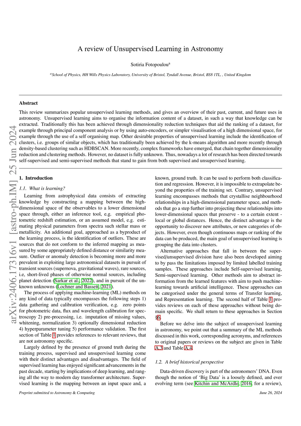 This review summarizes popular unsupervised learning methods, and gives an overview of their past, current, and future uses in astronomy. Unsupervised learning aims to organise the information content of a dataset, in such a way that knowledge can be extracted. Traditionally this has been achieved through dimensionality reduction techniques that aid the ranking of a dataset, for example through principal component analysis or by using auto-encoders, or simpler visualisation of a high dimensional space, for example through the use of a self organising map. Other desirable properties of unsupervised learning include the identification of clusters, i.e. groups of similar objects, which has traditionally been achieved by the k-means algorithm and more recently through density-based clustering such as HDBSCAN. More recently, complex frameworks have emerged, that chain together dimensionality reduction and clustering methods. However, no dataset is fully unknown. Thus, nowadays a lot of research has been directed towards self-supervised and semi-supervised methods that stand to gain from both supervised and unsupervised learning.