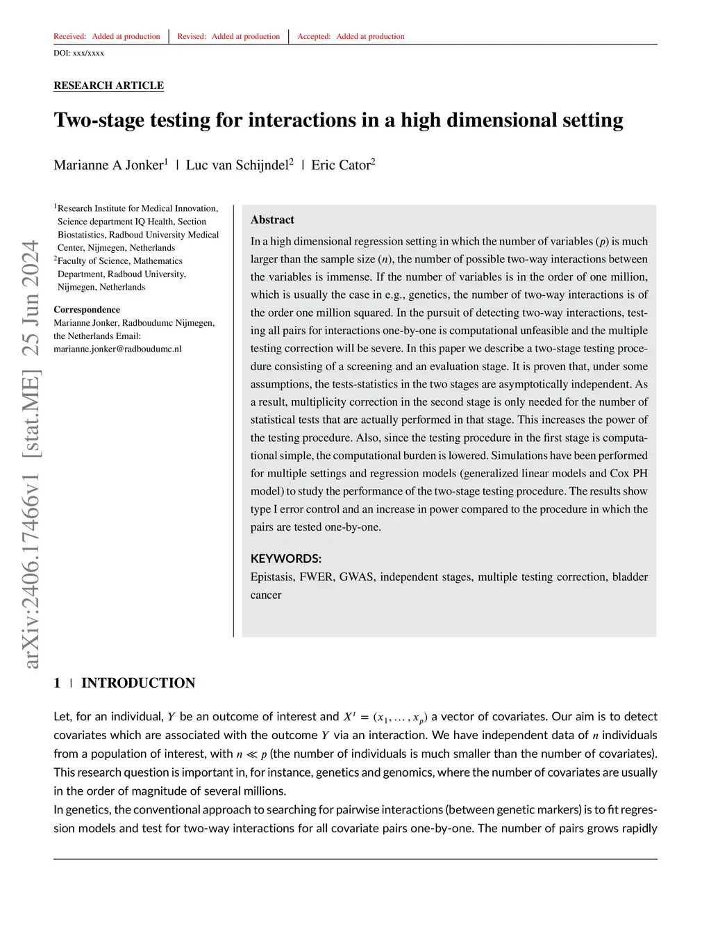 In a high dimensional regression setting in which the number of variables () is much larger than the sample size (), the number of possible two-way interactions between the variables is immense. If the number of variables is in the order of one million, which is usually the case in e.g., genetics, the number of two-way interactions is of the order one million squared. In the pursuit of detecting two-way interactions, testing all pairs for interactions one-by-one is computational unfeasible and the multiple testing correction will be severe. In this paper we describe a two-stage testing procedure consisting of a screening and an evaluation stage. It is proven that, under some assumptions, the tests-statistics in the two stages are asymptotically independent. As a result, multiplicity correction in the second stage is only needed for the number of statistical tests that are actually performed in that stage. This increases the power of the testing procedure. Also, since the testing procedure in the first stage is computational simple, the computational burden is lowered. Simulations have been performed for multiple settings and regression models (generalized linear models and Cox PH model) to study the performance of the two-stage testing procedure. The results show type I error control and an increase in power compared to the procedure in which the pairs are tested one-by-one.