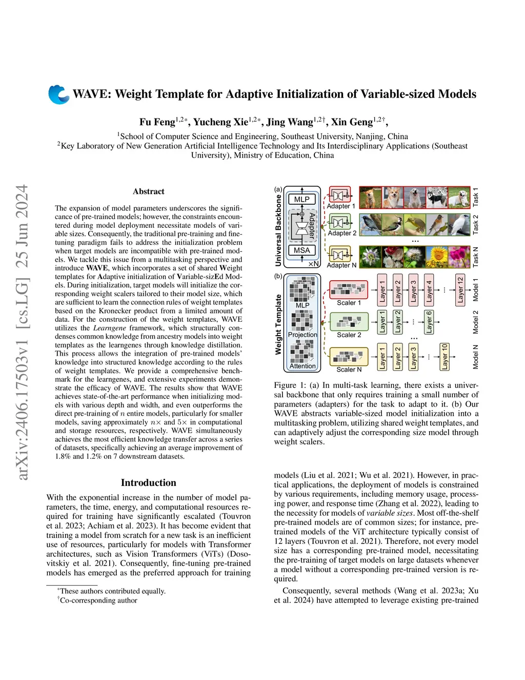 The growing complexity of model parameters underscores the significance of pre-trained models. However, deployment constraints often necessitate models of varying sizes, exposing limitations in the conventional pre-training and fine-tuning paradigm, particularly when target model sizes are incompatible with pre-trained ones. To address this challenge, we propose WAVE, a novel approach that reformulates variable-sized model initialization from a multi-task perspective, where initializing each model size is treated as a distinct task. WAVE employs shared, size-agnostic weight templates alongside size-specific weight scalers to achieve consistent initialization across various model sizes. These weight templates, constructed within the Learngene framework, integrate knowledge from pre-trained models through a distillation process constrained by Kronecker-based rules. Target models are then initialized by concatenating and weighting these templates, with adaptive connection rules established by lightweight weight scalers, whose parameters are learned from minimal training data. Extensive experiments demonstrate the efficiency of WAVE, achieving state-of-the-art performance in initializing models of various depth and width. The knowledge encapsulated in weight templates is also task-agnostic, allowing for seamless transfer across diverse downstream datasets. Code will be made available atthis https URL.