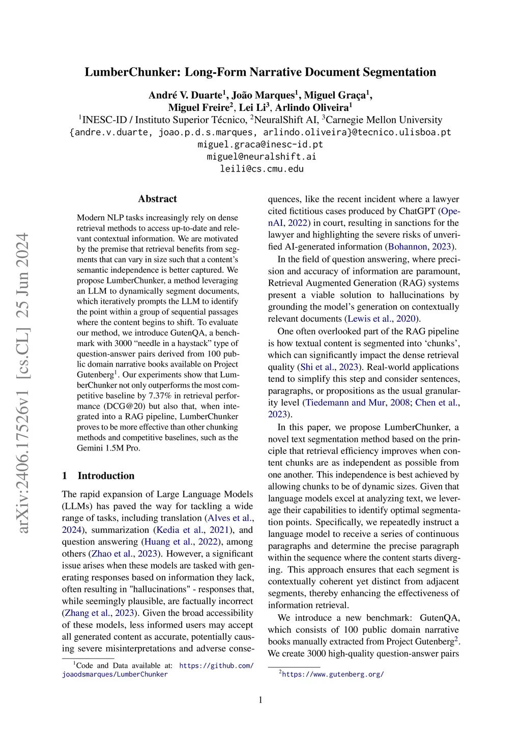 LumberChunker: Long-Form Narrative Document Segmentation
