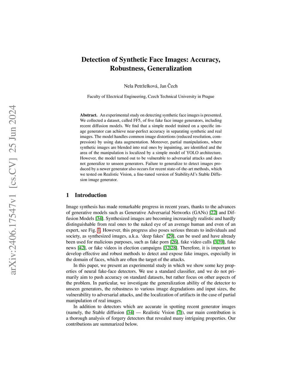 An experimental study on detecting synthetic face images is presented. We collected a dataset, called FF5, of five fake face image generators, including recent diffusion models. We find that a simple model trained on a specific image generator can achieve near-perfect accuracy in separating synthetic and real images. The model handles common image distortions (reduced resolution, compression) by using data augmentation. Moreover, partial manipulations, where synthetic images are blended into real ones by inpainting, are identified and the area of the manipulation is localized by a simple model of YOLO architecture. However, the model turned out to be vulnerable to adversarial attacks and does not generalize to unseen generators. Failure to generalize to detect images produced by a newer generator also occurs for recent state-of-the-art methods, which we tested on Realistic Vision, a fine-tuned version of StabilityAI's Stable Diffusion image generator.