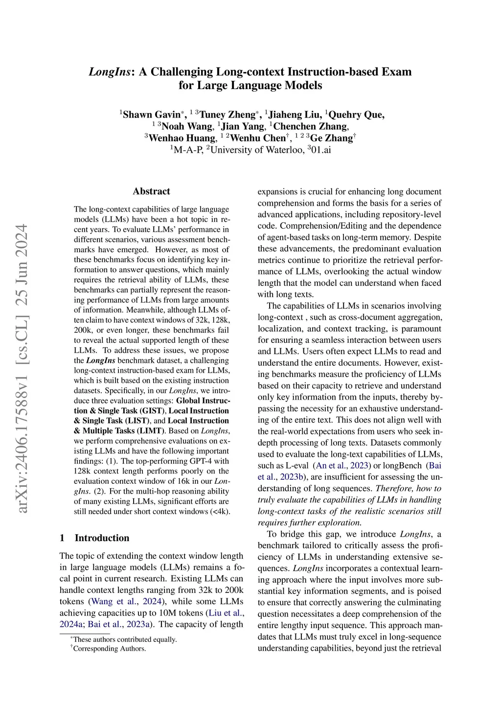 The long-context capabilities of large language models (LLMs) have been a hot topic in recent years. To evaluate the performance of LLMs in different scenarios, various assessment benchmarks have emerged. However, as most of these benchmarks focus on identifying key information to answer questions, which mainly requires the retrieval ability of LLMs, these benchmarks can partially represent the reasoning performance of LLMs from large amounts of information. Meanwhile, although LLMs often claim to have context windows of 32k, 128k, 200k, or even longer, these benchmarks fail to reveal the actual supported length of these LLMs. To address these issues, we propose the LongIns benchmark dataset, a challenging long-context instruction-based exam for LLMs, which is built based on the existing instruction datasets. Specifically, in our LongIns, we introduce three evaluation settings: Global Instruction & Single Task (GIST), Local Instruction & Single Task (LIST), and Local Instruction & Multiple Tasks (LIMT). Based on LongIns, we perform comprehensive evaluations on existing LLMs and have the following important findings: (1). The top-performing GPT-4 with 128k context length performs poorly on the evaluation context window of 16k in our LongIns. (2). For the multi-hop reasoning ability of many existing LLMs, significant efforts are still needed under short context windows (less than 4k).