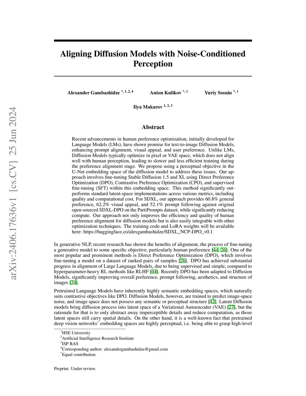 Recent advancements in human preference optimization, initially developed for Language Models (LMs), have shown promise for text-to-image Diffusion Models, enhancing prompt alignment, visual appeal, and user preference. Unlike LMs, Diffusion Models typically optimize in pixel or VAE space, which does not align well with human perception, leading to slower and less efficient training during the preference alignment stage. We propose using a perceptual objective in the U-Net embedding space of the diffusion model to address these issues. Our approach involves fine-tuning Stable Diffusion 1.5 and XL using Direct Preference Optimization (DPO), Contrastive Preference Optimization (CPO), and supervised fine-tuning (SFT) within this embedding space. This method significantly outperforms standard latent-space implementations across various metrics, including quality and computational cost. For SDXL, our approach provides 60.8\% general preference, 62.2\% visual appeal, and 52.1\% prompt following against original open-sourced SDXL-DPO on the PartiPrompts dataset, while significantly reducing compute. Our approach not only improves the efficiency and quality of human preference alignment for diffusion models but is also easily integrable with other optimization techniques. The training code and LoRA weights will be available here:this https URL\_NCP-DPO\_v0.1