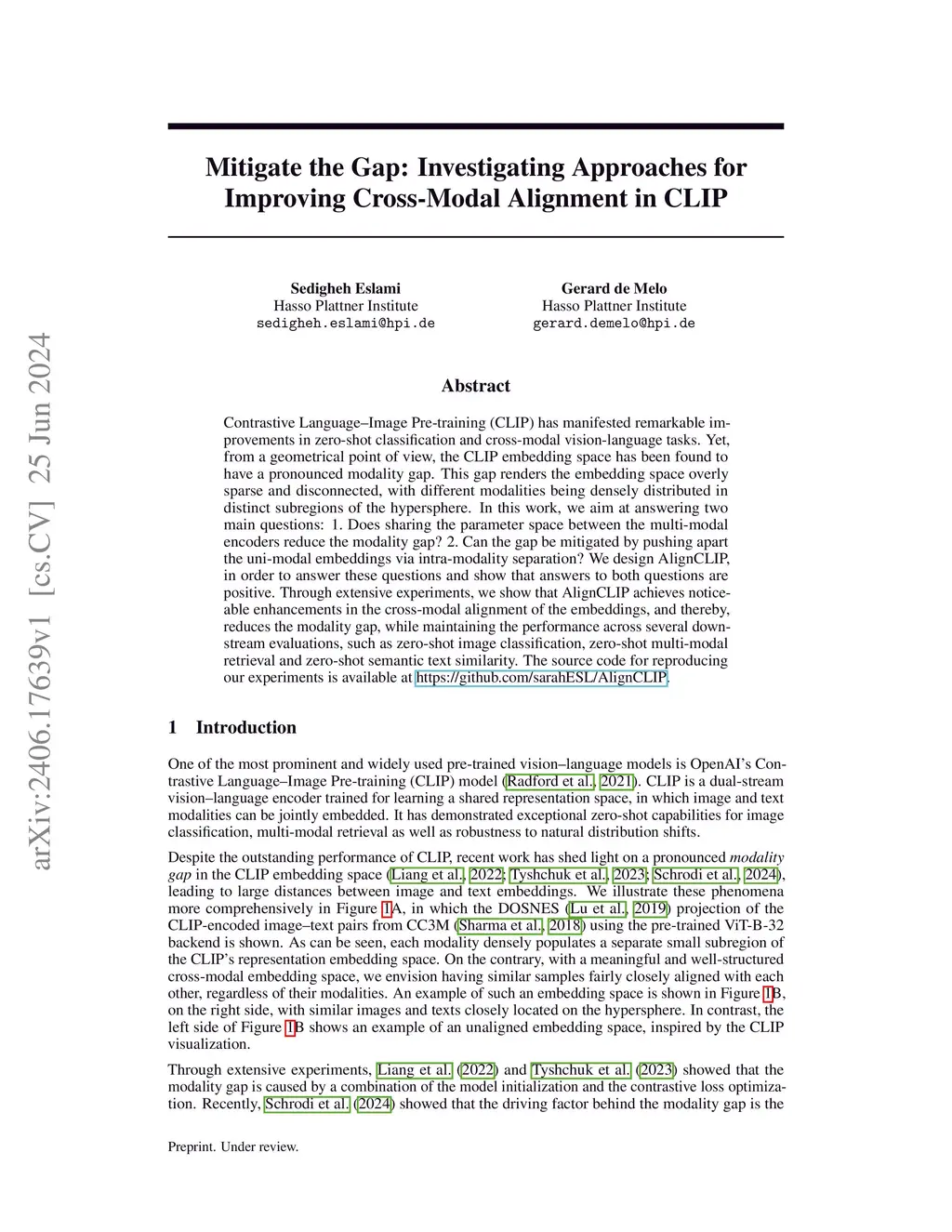 Contrastive Language--Image Pre-training (CLIP) has manifested remarkable improvements in zero-shot classification and cross-modal vision-language tasks. Yet, from a geometrical point of view, the CLIP embedding space has been found to have a pronounced modality gap. This gap renders the embedding space overly sparse and disconnected, with different modalities being densely distributed in distinct subregions of the hypersphere. In this work, we aim at answering two main questions: 1. Does sharing the parameter space between the multi-modal encoders reduce the modality gap? 2. Can the gap be mitigated by pushing apart the uni-modal embeddings via intra-modality separation? We design AlignCLIP, in order to answer these questions and show that answers to both questions are positive. Through extensive experiments, we show that AlignCLIP achieves noticeable enhancements in the cross-modal alignment of the embeddings, and thereby, reduces the modality gap, while maintaining the performance across several downstream evaluations, such as zero-shot image classification, zero-shot multi-modal retrieval and zero-shot semantic text similarity.