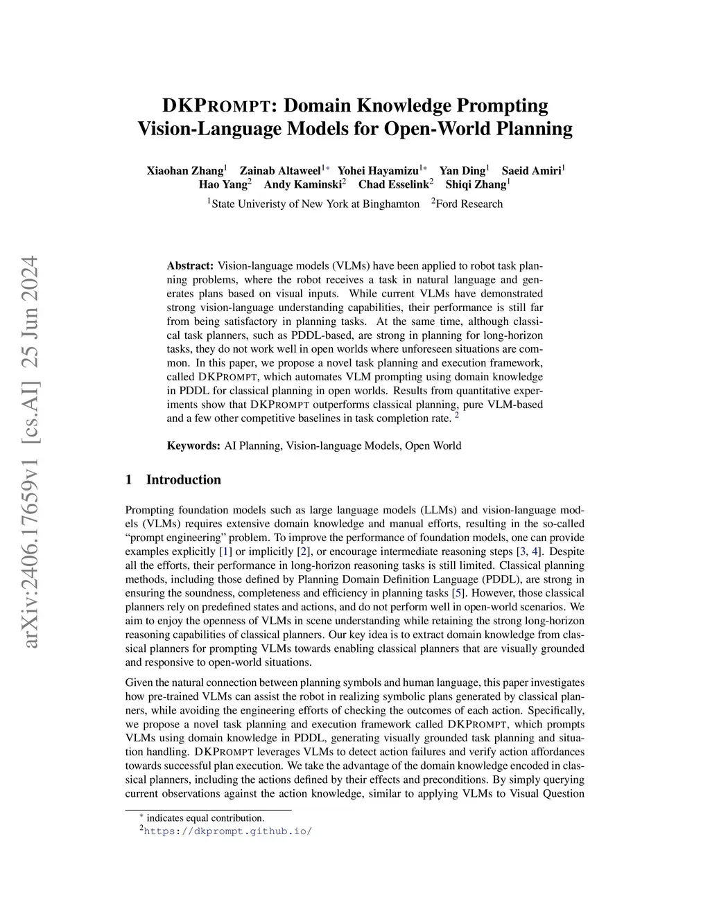 Vision-language models (VLMs) have been applied to robot task planning problems, where the robot receives a task in natural language and generates plans based on visual inputs. While current VLMs have demonstrated strong vision-language understanding capabilities, their performance is still far from being satisfactory in planning tasks. At the same time, although classical task planners, such as PDDL-based, are strong in planning for long-horizon tasks, they do not work well in open worlds where unforeseen situations are common. In this paper, we propose a novel task planning and execution framework, called DKPROMPT, which automates VLM prompting using domain knowledge in PDDL for classical planning in open worlds. Results from quantitative experiments show that DKPROMPT outperforms classical planning, pure VLM-based and a few other competitive baselines in task completion rate.