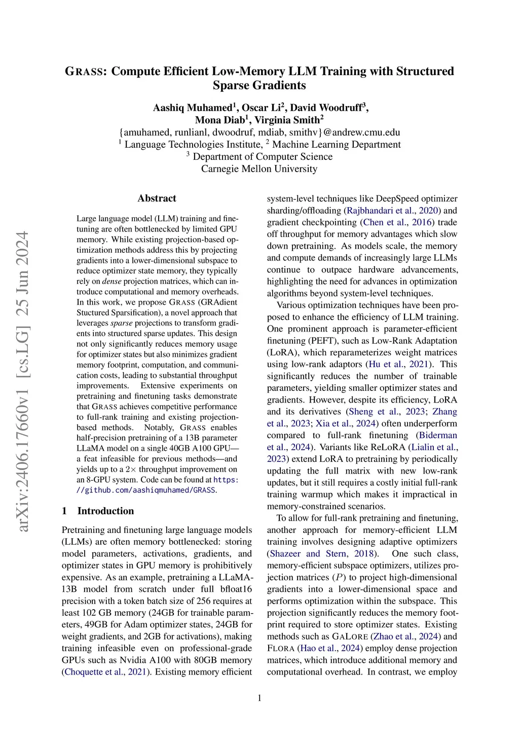 Large language model (LLM) training and finetuning are often bottlenecked by limited GPU memory. While existing projection-based optimization methods address this by projecting gradients into a lower-dimensional subspace to reduce optimizer state memory, they typically rely on dense projection matrices, which can introduce computational and memory overheads. In this work, we propose Grass (GRAdient Stuctured Sparsification), a novel approach that leverages sparse projections to transform gradients into structured sparse updates. This design not only significantly reduces memory usage for optimizer states but also minimizes gradient memory footprint, computation, and communication costs, leading to substantial throughput improvements. Extensive experiments on pretraining and finetuning tasks demonstrate that Grass achieves competitive performance to full-rank training and existing projection-based methods. Notably, Grass enables half-precision pretraining of a 13B parameter LLaMA model on a single 40GB A100 GPU--a feat infeasible for previous methods--and yields up to a throughput improvement on an 8-GPU system. Code can be found at https://github.com/aashiqmuhamed/GRASS .