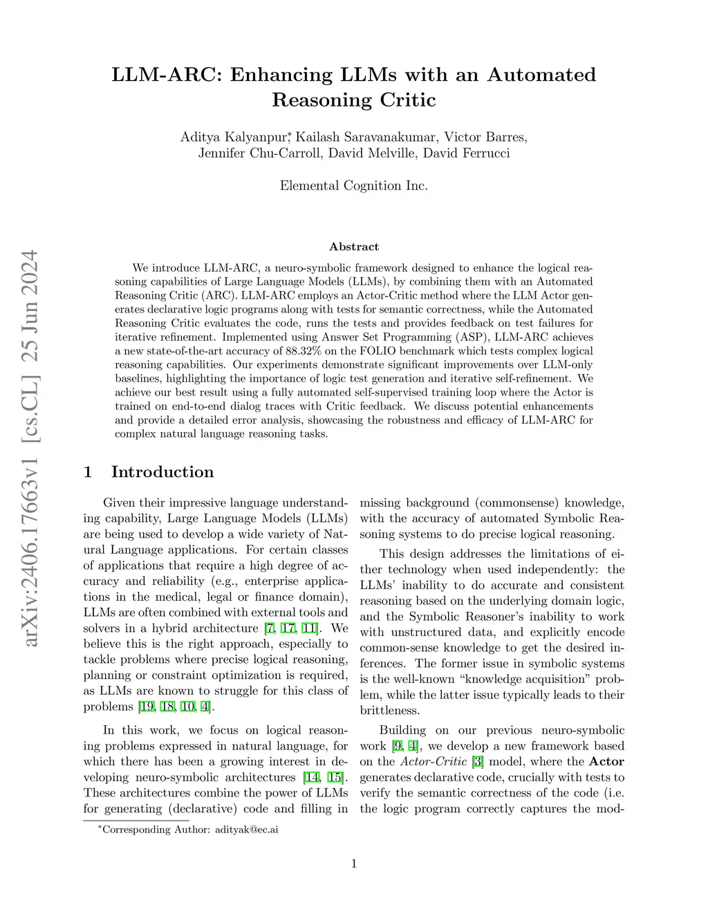 We introduce LLM-ARC, a neuro-symbolic framework designed to enhance the logical reasoning capabilities of Large Language Models (LLMs), by combining them with an Automated Reasoning Critic (ARC). LLM-ARC employs an Actor-Critic method where the LLM Actor generates declarative logic programs along with tests for semantic correctness, while the Automated Reasoning Critic evaluates the code, runs the tests and provides feedback on test failures for iterative refinement. Implemented using Answer Set Programming (ASP), LLM-ARC achieves a new state-of-the-art accuracy of 88.32% on the FOLIO benchmark which tests complex logical reasoning capabilities. Our experiments demonstrate significant improvements over LLM-only baselines, highlighting the importance of logic test generation and iterative self-refinement. We achieve our best result using a fully automated self-supervised training loop where the Actor is trained on end-to-end dialog traces with Critic feedback. We discuss potential enhancements and provide a detailed error analysis, showcasing the robustness and efficacy of LLM-ARC for complex natural language reasoning tasks.