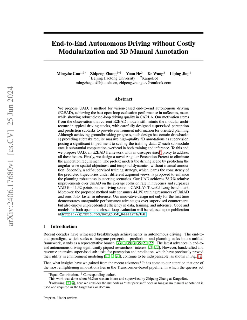 We propose UAD, a method for vision-based end-to-end autonomous driving (E2EAD), achieving the best open-loop evaluation performance in nuScenes, meanwhile showing robust closed-loop driving quality in CARLA. Our motivation stems from the observation that current E2EAD models still mimic the modular architecture in typical driving stacks, with carefully designed supervised perception and prediction subtasks to provide environment information for oriented planning. Although achieving groundbreaking progress, such design has certain drawbacks: 1) preceding subtasks require massive high-quality 3D annotations as supervision, posing a significant impediment to scaling the training data; 2) each submodule entails substantial computation overhead in both training and inference. To this end, we propose UAD, an E2EAD framework with an unsupervised proxy to address all these issues. Firstly, we design a novel Angular Perception Pretext to eliminate the annotation requirement. The pretext models the driving scene by predicting the angular-wise spatial objectness and temporal dynamics, without manual annotation. Secondly, a self-supervised training strategy, which learns the consistency of the predicted trajectories under different augment views, is proposed to enhance the planning robustness in steering scenarios. Our UAD achieves 38.7% relative improvements over UniAD on the average collision rate in nuScenes and surpasses VAD for 41.32 points on the driving score in CARLA's Town05 Long benchmark. Moreover, the proposed method only consumes 44.3% training resources of UniAD and runs 3.4 times faster in inference. Our innovative design not only for the first time demonstrates unarguable performance advantages over supervised counterparts, but also enjoys unprecedented efficiency in data, training, and inference. Code and models will be released at https://github.com/KargoBot_Research/UAD.