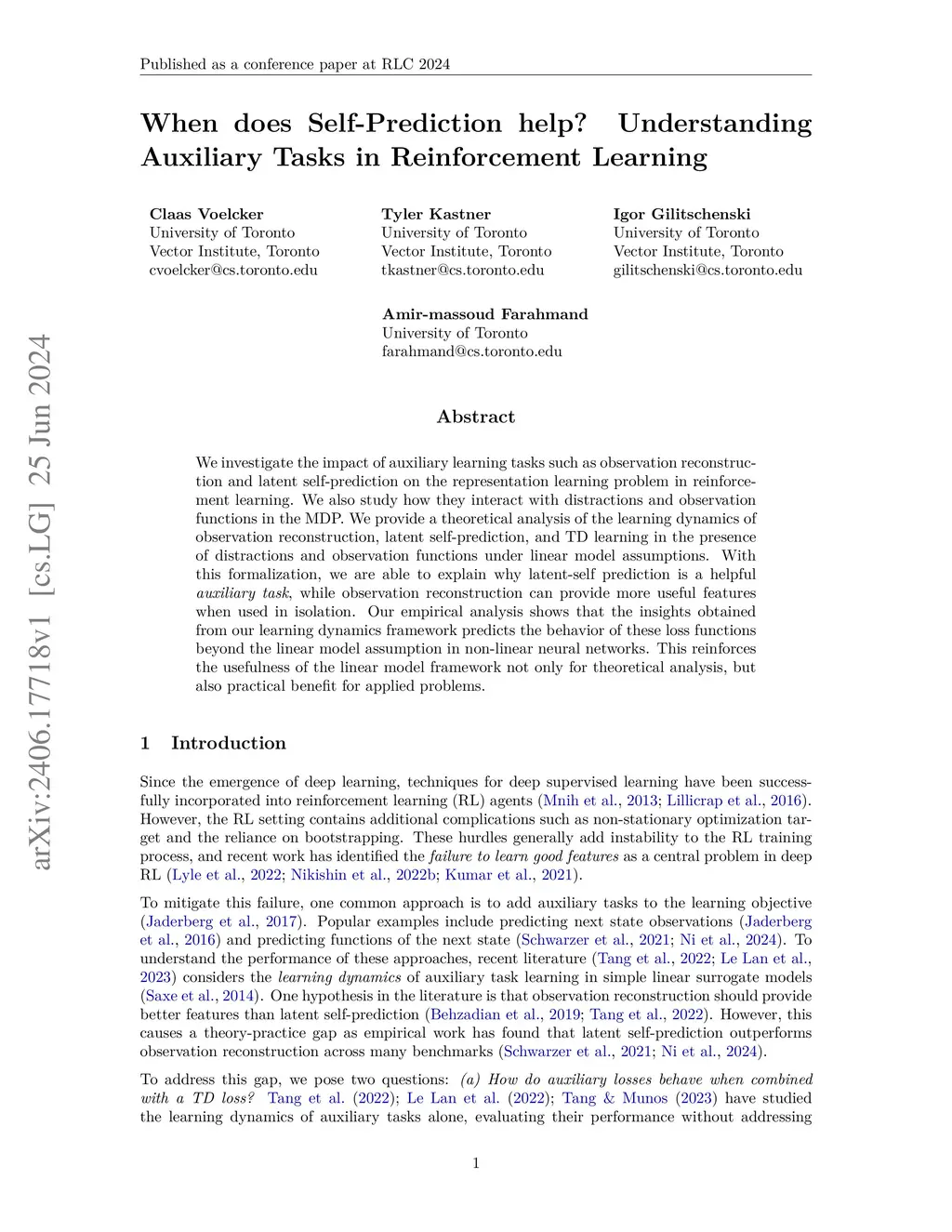 We investigate the impact of auxiliary learning tasks such as observation reconstruction and latent self-prediction on the representation learning problem in reinforcement learning. We also study how they interact with distractions and observation functions in the MDP. We provide a theoretical analysis of the learning dynamics of observation reconstruction, latent self-prediction, and TD learning in the presence of distractions and observation functions under linear model assumptions. With this formalization, we are able to explain why latent-self prediction is a helpful \emph{auxiliary task}, while observation reconstruction can provide more useful features when used in isolation. Our empirical analysis shows that the insights obtained from our learning dynamics framework predicts the behavior of these loss functions beyond the linear model assumption in non-linear neural networks. This reinforces the usefulness of the linear model framework not only for theoretical analysis, but also practical benefit for applied problems.