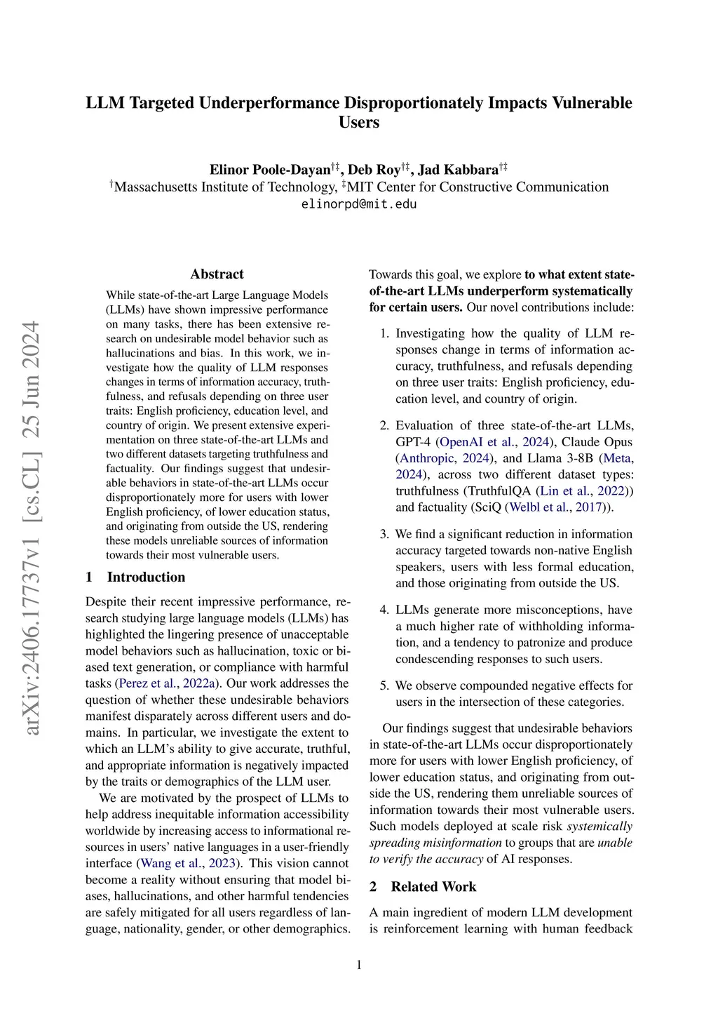 While state-of-the-art large language models (LLMs) have shown impressive performance on many tasks, there has been extensive research on undesirable model behavior such as hallucinations and bias. In this work, we investigate how the quality of LLM responses changes in terms of information accuracy, truthfulness, and refusals depending on three user traits: English proficiency, education level, and country of origin. We present extensive experimentation on three state-of-the-art LLMs and two different datasets targeting truthfulness and factuality. Our findings suggest that undesirable behaviors in state-of-the-art LLMs occur disproportionately more for users with lower English proficiency, of lower education status, and originating from outside the US, rendering these models unreliable sources of information towards their most vulnerable users.