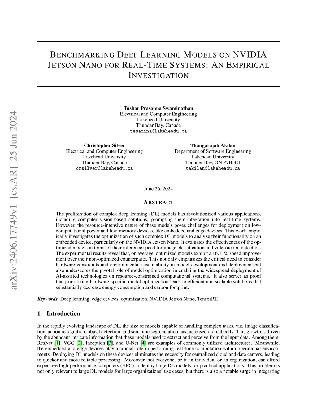 The proliferation of complex deep learning (DL) models has revolutionized various applications, including computer vision-based solutions, prompting their integration into real-time systems. However, the resource-intensive nature of these models poses challenges for deployment on low-computational power and low-memory devices, like embedded and edge devices. This work empirically investigates the optimization of such complex DL models to analyze their functionality on an embedded device, particularly on the NVIDIA Jetson Nano. It evaluates the effectiveness of the optimized models in terms of their inference speed for image classification and video action detection. The experimental results reveal that, on average, optimized models exhibit a 16.11% speed improvement over their non-optimized counterparts. This not only emphasizes the critical need to consider hardware constraints and environmental sustainability in model development and deployment but also underscores the pivotal role of model optimization in enabling the widespread deployment of AI-assisted technologies on resource-constrained computational systems. It also serves as proof that prioritizing hardware-specific model optimization leads to efficient and scalable solutions that substantially decrease energy consumption and carbon footprint.