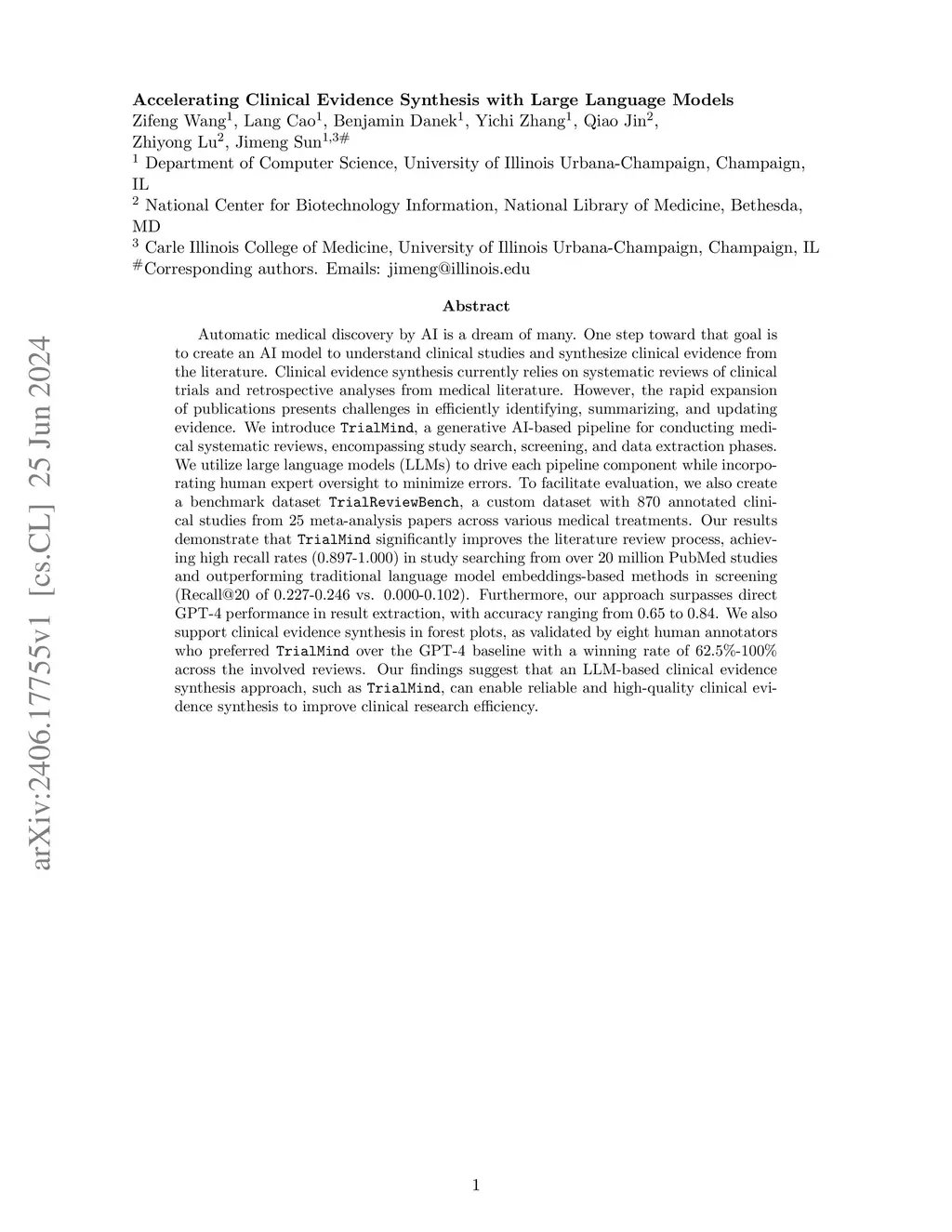 Automatic medical discovery by AI is a dream of many. One step toward that goal is to create an AI model to understand clinical studies and synthesize clinical evidence from the literature. Clinical evidence synthesis currently relies on systematic reviews of clinical trials and retrospective analyses from medical literature. However, the rapid expansion of publications presents challenges in efficiently identifying, summarizing, and updating evidence. We introduce TrialMind, a generative AI-based pipeline for conducting medical systematic reviews, encompassing study search, screening, and data extraction phases. We utilize large language models (LLMs) to drive each pipeline component while incorporating human expert oversight to minimize errors. To facilitate evaluation, we also create a benchmark dataset TrialReviewBench, a custom dataset with 870 annotated clinical studies from 25 meta-analysis papers across various medical treatments. Our results demonstrate that TrialMind significantly improves the literature review process, achieving high recall rates (0.897-1.000) in study searching from over 20 million PubMed studies and outperforming traditional language model embeddings-based methods in screening (Recall@20 of 0.227-0.246 vs. 0.000-0.102). Furthermore, our approach surpasses direct GPT-4 performance in result extraction, with accuracy ranging from 0.65 to 0.84. We also support clinical evidence synthesis in forest plots, as validated by eight human annotators who preferred TrialMind over the GPT-4 baseline with a winning rate of 62.5%-100% across the involved reviews. Our findings suggest that an LLM-based clinical evidence synthesis approach, such as TrialMind, can enable reliable and high-quality clinical evidence synthesis to improve clinical research efficiency.