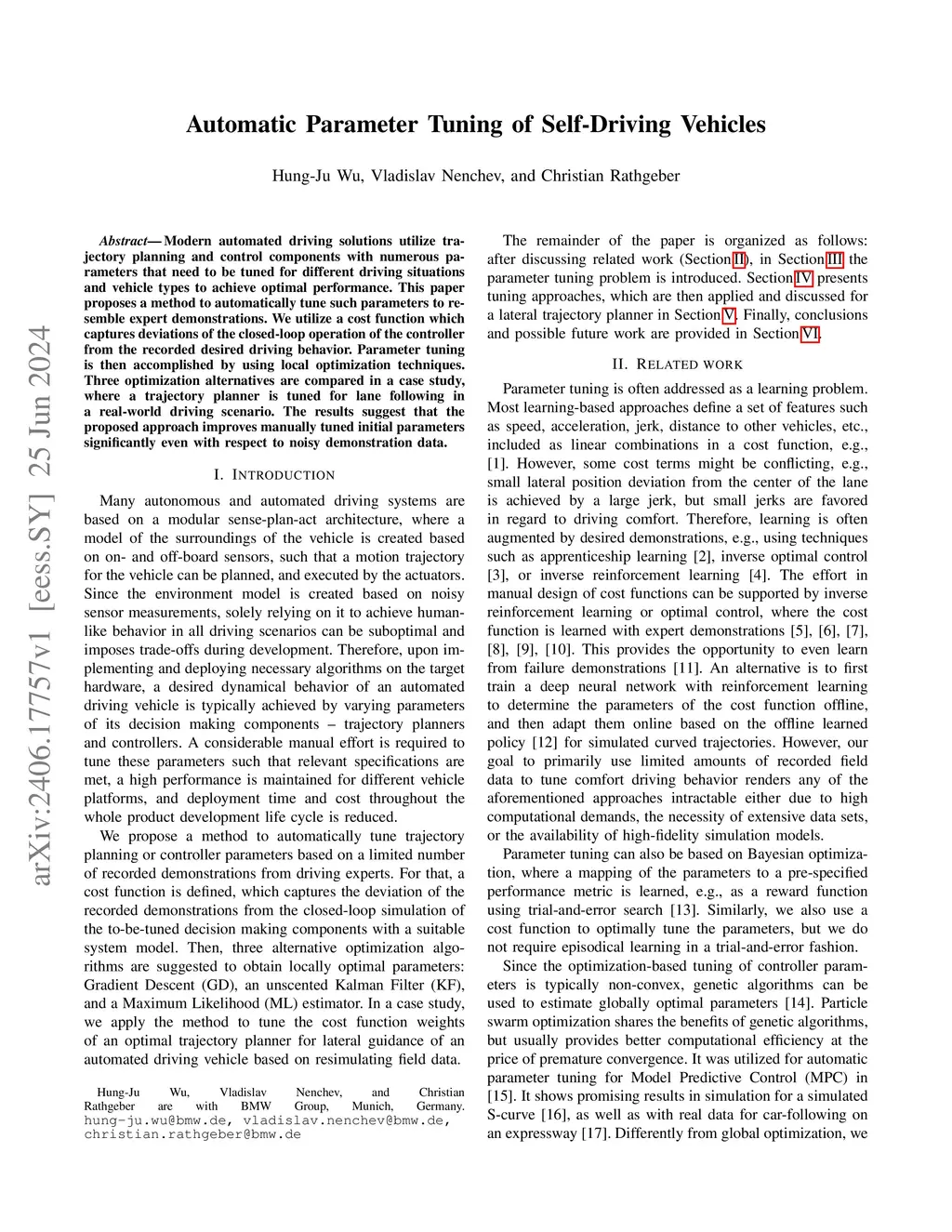 Automatic Parameter Tuning of Self-Driving Vehicles