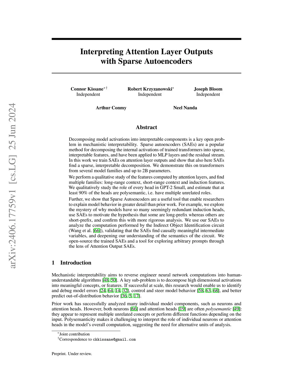 Decomposing model activations into interpretable components is a key open problem in mechanistic interpretability. Sparse autoencoders (SAEs) are a popular method for decomposing the internal activations of trained transformers into sparse, interpretable features, and have been applied to MLP layers and the residual stream. In this work we train SAEs on attention layer outputs and show that also here SAEs find a sparse, interpretable decomposition. We demonstrate this on transformers from several model families and up to 2B parameters. We perform a qualitative study of the features computed by attention layers, and find multiple families: long-range context, short-range context and induction features. We qualitatively study the role of every head in GPT-2 Small, and estimate that at least 90% of the heads are polysemantic, i.e. have multiple unrelated roles. Further, we show that Sparse Autoencoders are a useful tool that enable researchers to explain model behavior in greater detail than prior work. For example, we explore the mystery of why models have so many seemingly redundant induction heads, use SAEs to motivate the hypothesis that some are long-prefix whereas others are short-prefix, and confirm this with more rigorous analysis. We use our SAEs to analyze the computation performed by the Indirect Object Identification circuit (Wang et al.), validating that the SAEs find causally meaningful intermediate variables, and deepening our understanding of the semantics of the circuit. We open-source the trained SAEs and a tool for exploring arbitrary prompts through the lens of Attention Output SAEs.