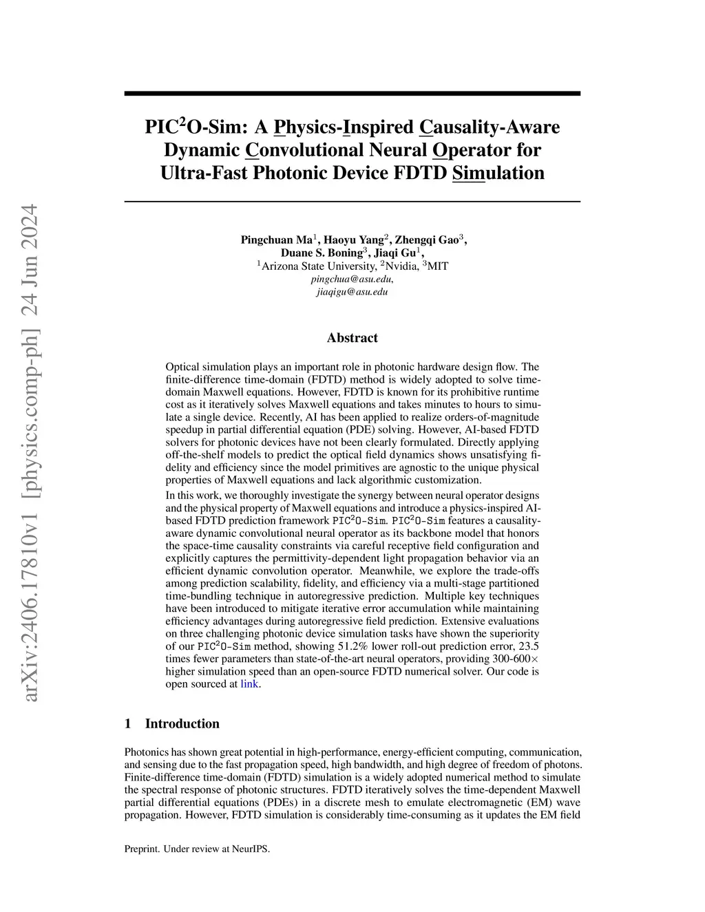 The finite-difference time-domain (FDTD) method, which is important in photonic hardware design flow, is widely adopted to solve time-domain Maxwell equations. However, FDTD is known for its prohibitive runtime cost, taking minutes to hours to simulate a single device. Recently, AI has been applied to realize orders-of-magnitude speedup in partial differential equation (PDE) solving. However, AI-based FDTD solvers for photonic devices have not been clearly formulated. Directly applying off-the-shelf models to predict the optical field dynamics shows unsatisfying fidelity and efficiency since the model primitives are agnostic to the unique physical properties of Maxwell equations and lack algorithmic customization. In this work, we thoroughly investigate the synergy between neural operator designs and the physical property of Maxwell equations and introduce a physics-inspired AI-based FDTD prediction framework PIC2O-Sim which features a causality-aware dynamic convolutional neural operator as its backbone model that honors the space-time causality constraints via careful receptive field configuration and explicitly captures the permittivity-dependent light propagation behavior via an efficient dynamic convolution operator. Meanwhile, we explore the trade-offs among prediction scalability, fidelity, and efficiency via a multi-stage partitioned time-bundling technique in autoregressive prediction. Multiple key techniques have been introduced to mitigate iterative error accumulation while maintaining efficiency advantages during autoregressive field prediction. Extensive evaluations on three challenging photonic device simulation tasks have shown the superiority of our PIC2O-Sim method, showing 51.2% lower roll-out prediction error, 23.5 times fewer parameters than state-of-the-art neural operators, providing 300-600x higher simulation speed than an open-source FDTD numerical solver.