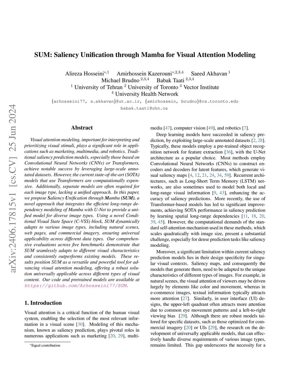 Visual attention modeling, important for interpreting and prioritizing visual stimuli, plays a significant role in applications such as marketing, multimedia, and robotics. Traditional saliency prediction models, especially those based on Convolutional Neural Networks (CNNs) or Transformers, achieve notable success by leveraging large-scale annotated datasets. However, the current state-of-the-art (SOTA) models that use Transformers are computationally expensive. Additionally, separate models are often required for each image type, lacking a unified approach. In this paper, we propose Saliency Unification through Mamba (SUM), a novel approach that integrates the efficient long-range dependency modeling of Mamba with U-Net to provide a unified model for diverse image types. Using a novel Conditional Visual State Space (C-VSS) block, SUM dynamically adapts to various image types, including natural scenes, web pages, and commercial imagery, ensuring universal applicability across different data types. Our comprehensive evaluations across five benchmarks demonstrate that SUM seamlessly adapts to different visual characteristics and consistently outperforms existing models. These results position SUM as a versatile and powerful tool for advancing visual attention modeling, offering a robust solution universally applicable across different types of visual content.