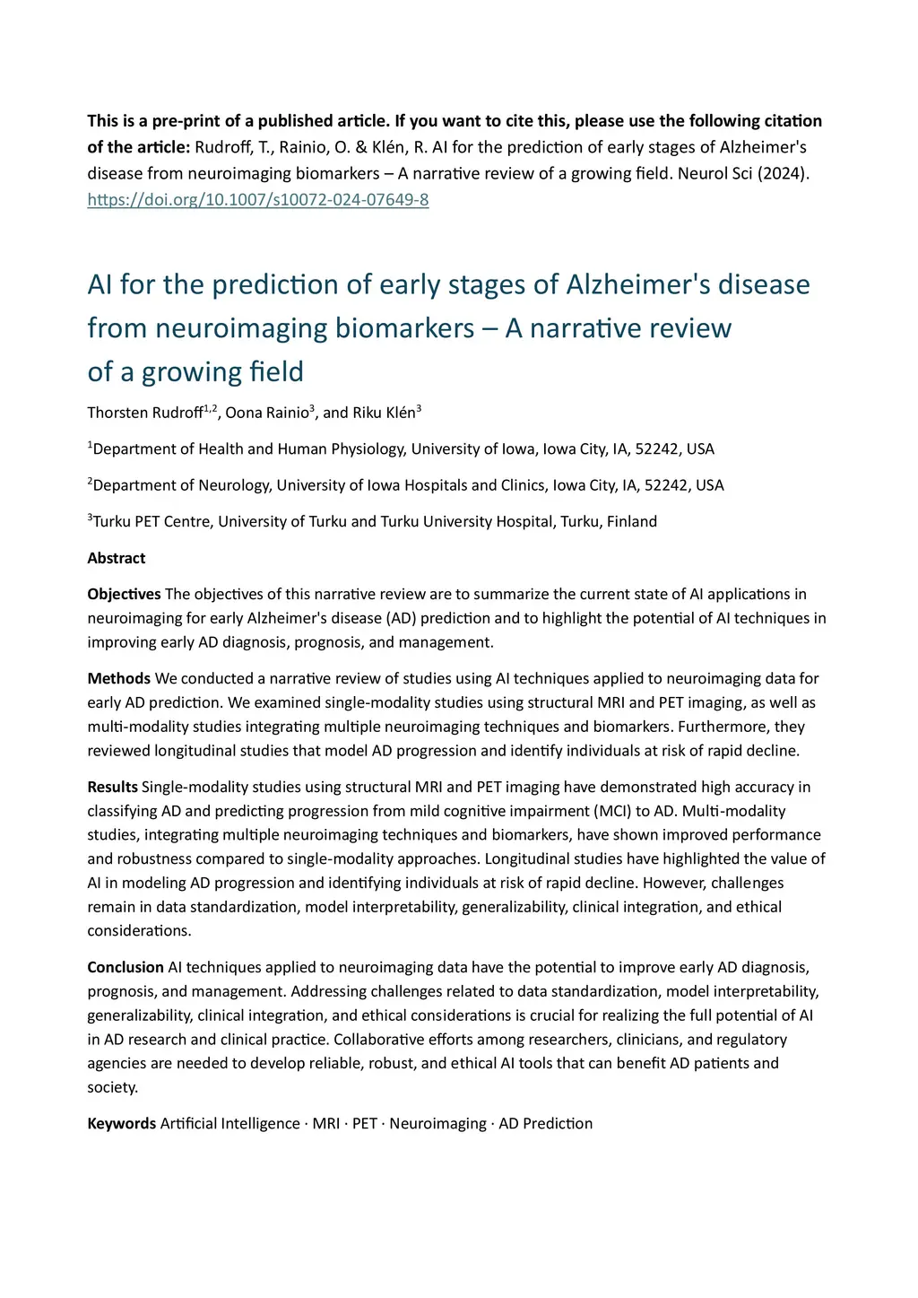 Objectives: The objectives of this narrative review are to summarize the current state of AI applications in neuroimaging for early Alzheimer's disease (AD) prediction and to highlight the potential of AI techniques in improving early AD diagnosis, prognosis, and management. Methods: We conducted a narrative review of studies using AI techniques applied to neuroimaging data for early AD prediction. We examined single-modality studies using structural MRI and PET imaging, as well as multi-modality studies integrating multiple neuroimaging techniques and biomarkers. Furthermore, they reviewed longitudinal studies that model AD progression and identify individuals at risk of rapid decline. Results: Single-modality studies using structural MRI and PET imaging have demonstrated high accuracy in classifying AD and predicting progression from mild cognitive impairment (MCI) to AD. Multi-modality studies, integrating multiple neuroimaging techniques and biomarkers, have shown improved performance and robustness compared to single-modality approaches. Longitudinal studies have highlighted the value of AI in modeling AD progression and identifying individuals at risk of rapid decline. However, challenges remain in data standardization, model interpretability, generalizability, clinical integration, and ethical considerations. Conclusion: AI techniques applied to neuroimaging data have the potential to improve early AD diagnosis, prognosis, and management. Addressing challenges related to data standardization, model interpretability, generalizability, clinical integration, and ethical considerations is crucial for realizing the full potential of AI in AD research and clinical practice. Collaborative efforts among researchers, clinicians, and regulatory agencies are needed to develop reliable, robust, and ethical AI tools that can benefit AD patients and society.