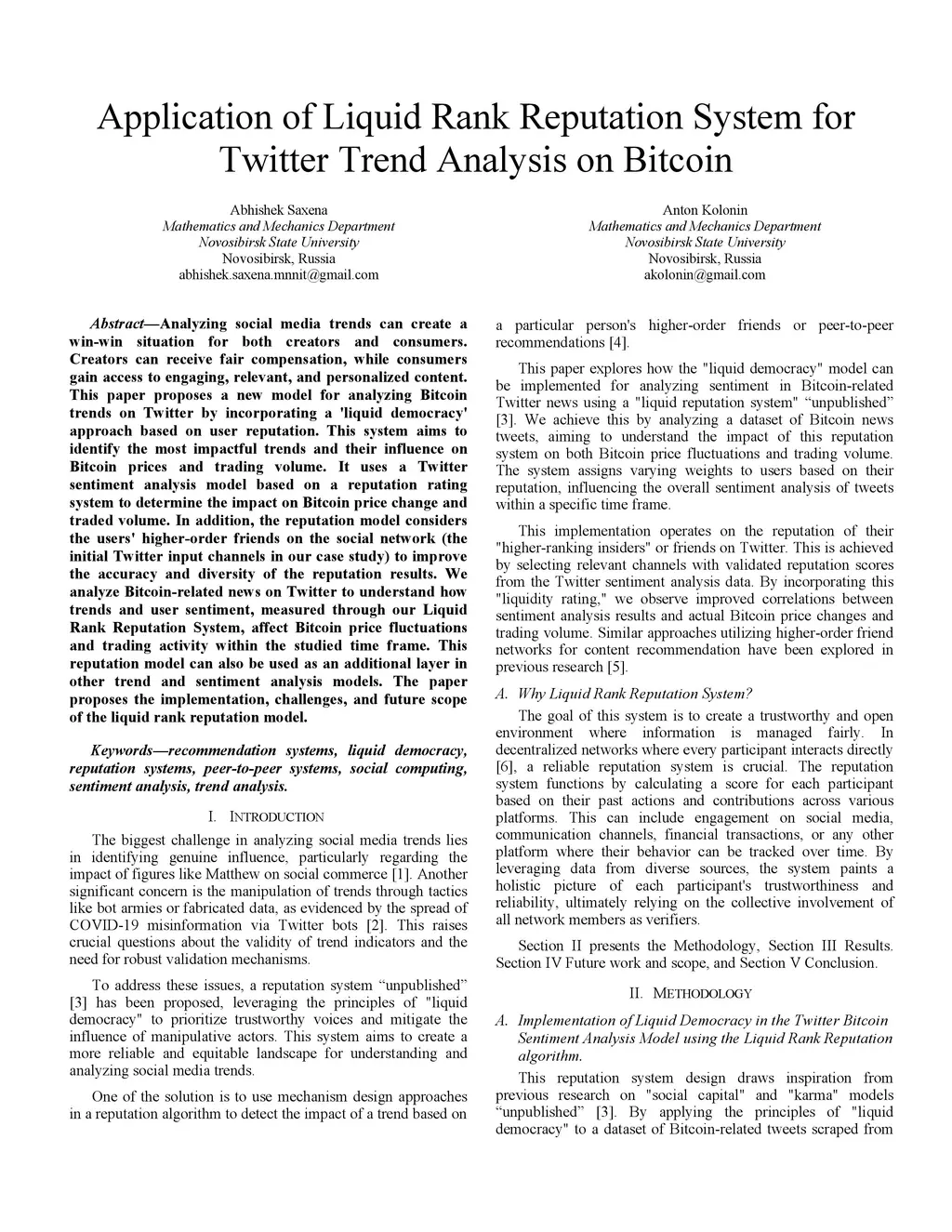 Analyzing social media trends can create a win-win situation for both creators and consumers. Creators can receive fair compensation, while consumers gain access to engaging, relevant, and personalized content. This paper proposes a new model for analyzing Bitcoin trends on Twitter by incorporating a 'liquid democracy' approach based on user reputation. This system aims to identify the most impactful trends and their influence on Bitcoin prices and trading volume. It uses a Twitter sentiment analysis model based on a reputation rating system to determine the impact on Bitcoin price change and traded volume. In addition, the reputation model considers the users' higher-order friends on the social network (the initial Twitter input channels in our case study) to improve the accuracy and diversity of the reputation results. We analyze Bitcoin-related news on Twitter to understand how trends and user sentiment, measured through our Liquid Rank Reputation System, affect Bitcoin price fluctuations and trading activity within the studied time frame. This reputation model can also be used as an additional layer in other trend and sentiment analysis models. The paper proposes the implementation, challenges, and future scope of the liquid rank reputation model.