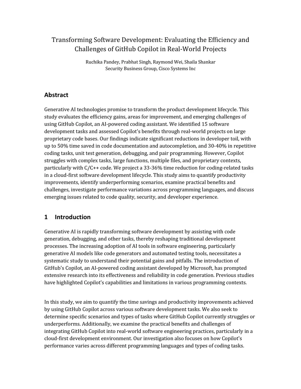 Generative AI technologies promise to transform the product development lifecycle. This study evaluates the efficiency gains, areas for improvement, and emerging challenges of using GitHub Copilot, an AI-powered coding assistant. We identified 15 software development tasks and assessed Copilot's benefits through real-world projects on large proprietary code bases. Our findings indicate significant reductions in developer toil, with up to 50% time saved in code documentation and autocompletion, and 30-40% in repetitive coding tasks, unit test generation, debugging, and pair programming. However, Copilot struggles with complex tasks, large functions, multiple files, and proprietary contexts, particularly with C/C++ code. We project a 33-36% time reduction for coding-related tasks in a cloud-first software development lifecycle. This study aims to quantify productivity improvements, identify underperforming scenarios, examine practical benefits and challenges, investigate performance variations across programming languages, and discuss emerging issues related to code quality, security, and developer experience.
