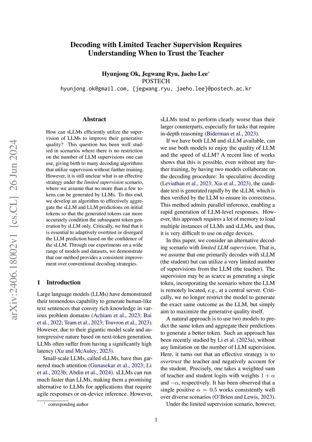 How can sLLMs efficiently utilize the supervision of LLMs to improve their generative quality? This question has been well studied in scenarios where there is no restriction on the number of LLM supervisions one can use, giving birth to many decoding algorithms that utilize supervision without further training. However, it is still unclear what is an effective strategy under the limited supervision scenario, where we assume that no more than a few tokens can be generated by LLMs. To this end, we develop an algorithm to effectively aggregate the sLLM and LLM predictions on initial tokens so that the generated tokens can more accurately condition the subsequent token generation by sLLM only. Critically, we find that it is essential to adaptively overtrust or disregard the LLM prediction based on the confidence of the sLLM. Through our experiments on a wide range of models and datasets, we demonstrate that our method provides a consistent improvement over conventional decoding strategies.
