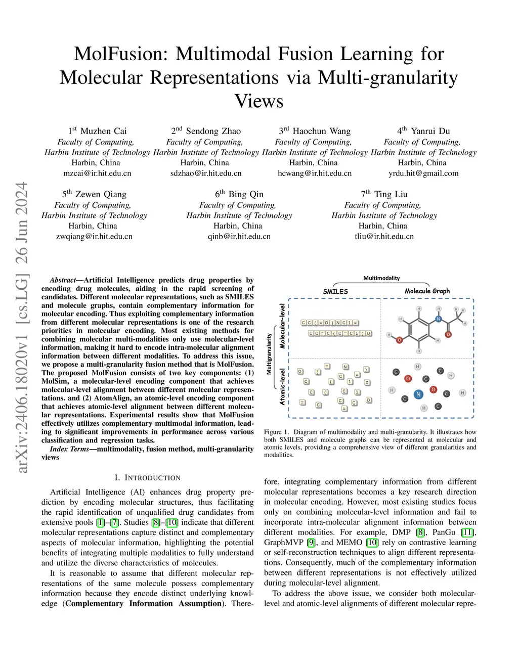 Artificial Intelligence predicts drug properties by encoding drug molecules, aiding in the rapid screening of candidates. Different molecular representations, such as SMILES and molecule graphs, contain complementary information for molecular encoding. Thus exploiting complementary information from different molecular representations is one of the research priorities in molecular encoding. Most existing methods for combining molecular multi-modalities only use molecular-level information, making it hard to encode intra-molecular alignment information between different modalities. To address this issue, we propose a multi-granularity fusion method that is MolFusion. The proposed MolFusion consists of two key components: (1) MolSim, a molecular-level encoding component that achieves molecular-level alignment between different molecular representations. and (2) AtomAlign, an atomic-level encoding component that achieves atomic-level alignment between different molecular representations. Experimental results show that MolFusion effectively utilizes complementary multimodal information, leading to significant improvements in performance across various classification and regression tasks.