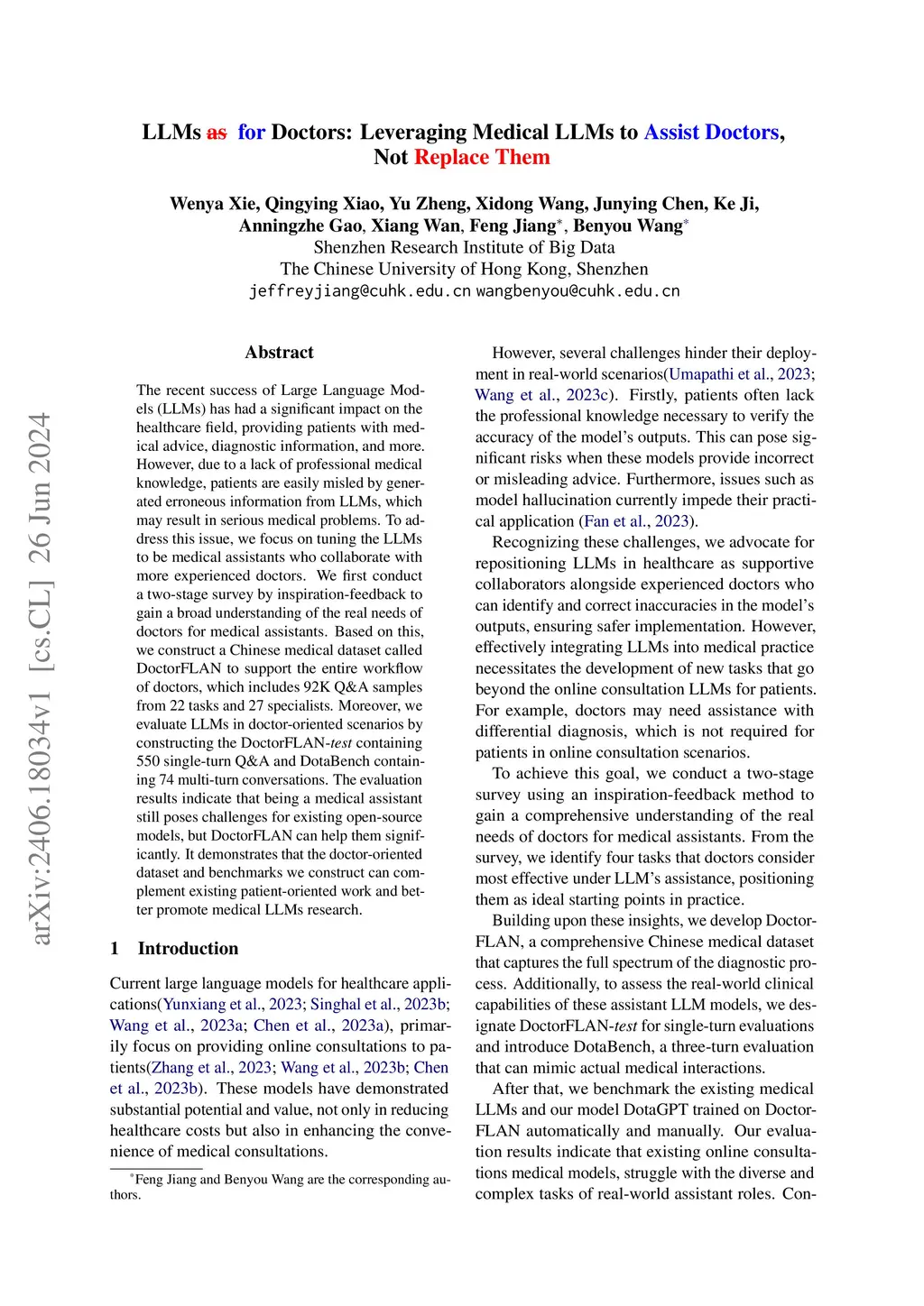 The recent success of Large Language Models (LLMs) has had a significant impact on the healthcare field, providing patients with medical advice, diagnostic information, and more. However, due to a lack of professional medical knowledge, patients are easily misled by generated erroneous information from LLMs, which may result in serious medical problems. To address this issue, we focus on tuning the LLMs to be medical assistants who collaborate with more experienced doctors. We first conduct a two-stage survey by inspiration-feedback to gain a broad understanding of the real needs of doctors for medical assistants. Based on this, we construct a Chinese medical dataset called DoctorFLAN to support the entire workflow of doctors, which includes 92K Q\&A samples from 22 tasks and 27 specialists. Moreover, we evaluate LLMs in doctor-oriented scenarios by constructing the DoctorFLAN-\textit{test} containing 550 single-turn Q\&A and DotaBench containing 74 multi-turn conversations. The evaluation results indicate that being a medical assistant still poses challenges for existing open-source models, but DoctorFLAN can help them significantly. It demonstrates that the doctor-oriented dataset and benchmarks we construct can complement existing patient-oriented work and better promote medical LLMs research.