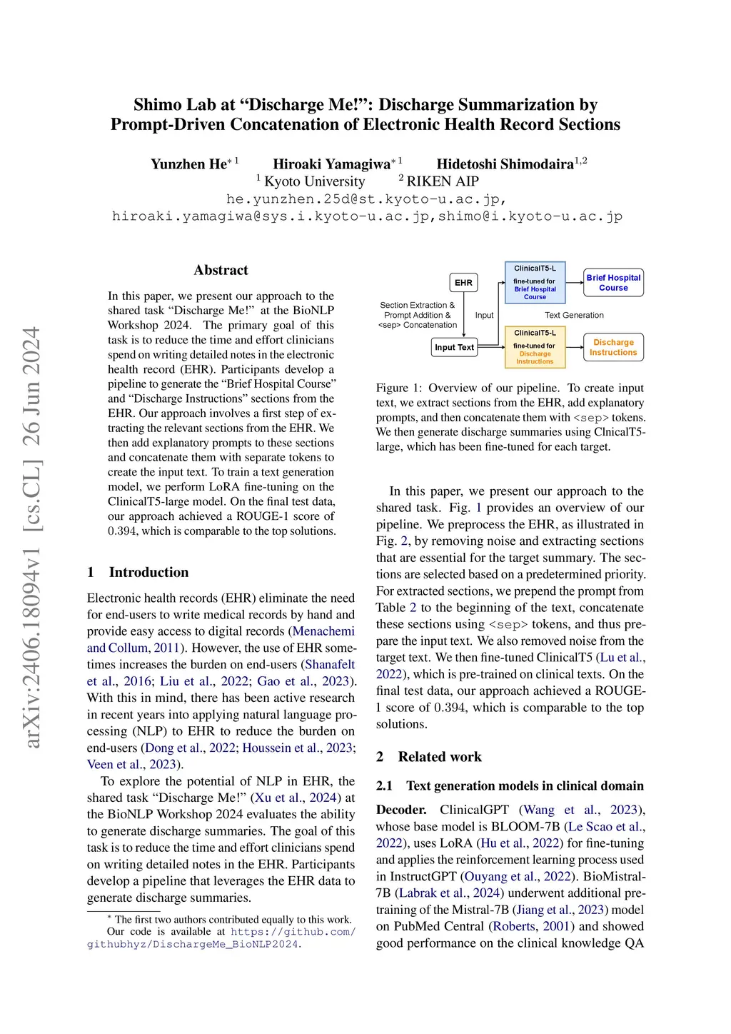 In this paper, we present our approach to the shared task "Discharge Me!" at the BioNLP Workshop 2024. The primary goal of this task is to reduce the time and effort clinicians spend on writing detailed notes in the electronic health record (EHR). Participants develop a pipeline to generate the "Brief Hospital Course" and "Discharge Instructions" sections from the EHR. Our approach involves a first step of extracting the relevant sections from the EHR. We then add explanatory prompts to these sections and concatenate them with separate tokens to create the input text. To train a text generation model, we perform LoRA fine-tuning on the ClinicalT5-large model. On the final test data, our approach achieved a ROUGE-1 score of , which is comparable to the top solutions.