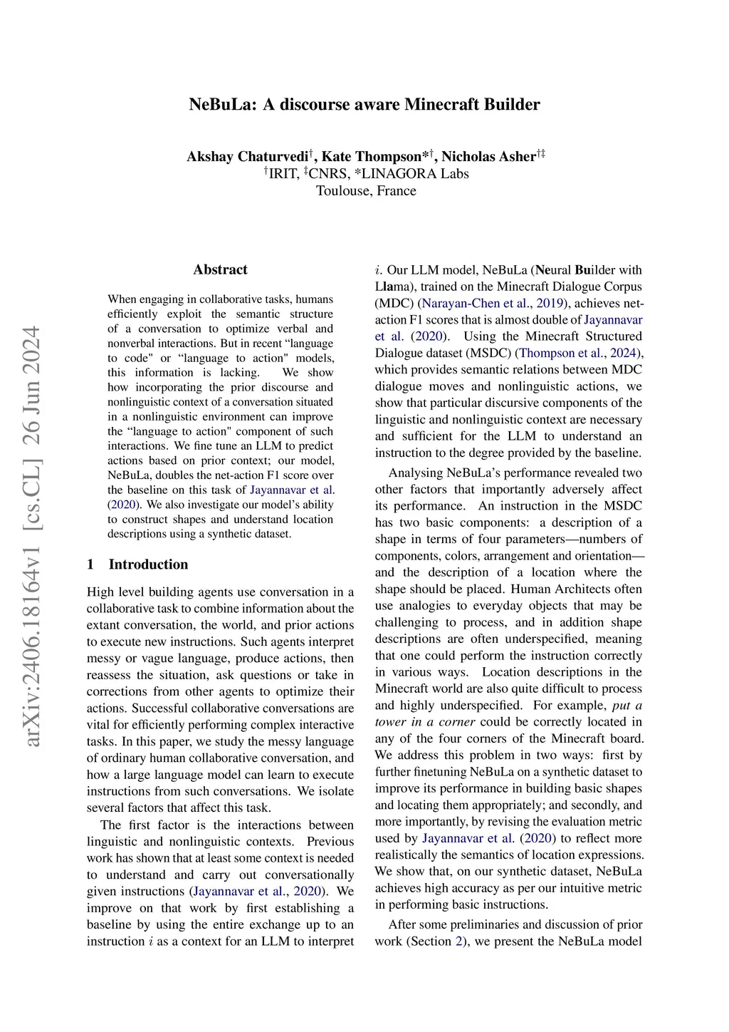 When engaging in collaborative tasks, humans efficiently exploit the semantic structure of a conversation to optimize verbal and nonverbal interactions. But in recent "language to code" or "language to action" models, this information is lacking. We show how incorporating the prior discourse and nonlinguistic context of a conversation situated in a nonlinguistic environment can improve the "language to action" component of such interactions. We fine tune an LLM to predict actions based on prior context; our model, NeBuLa, doubles the net-action F1 score over the baseline on this task of Jayannavar et al.(2020). We also investigate our model's ability to construct shapes and understand location descriptions using a synthetic dataset.