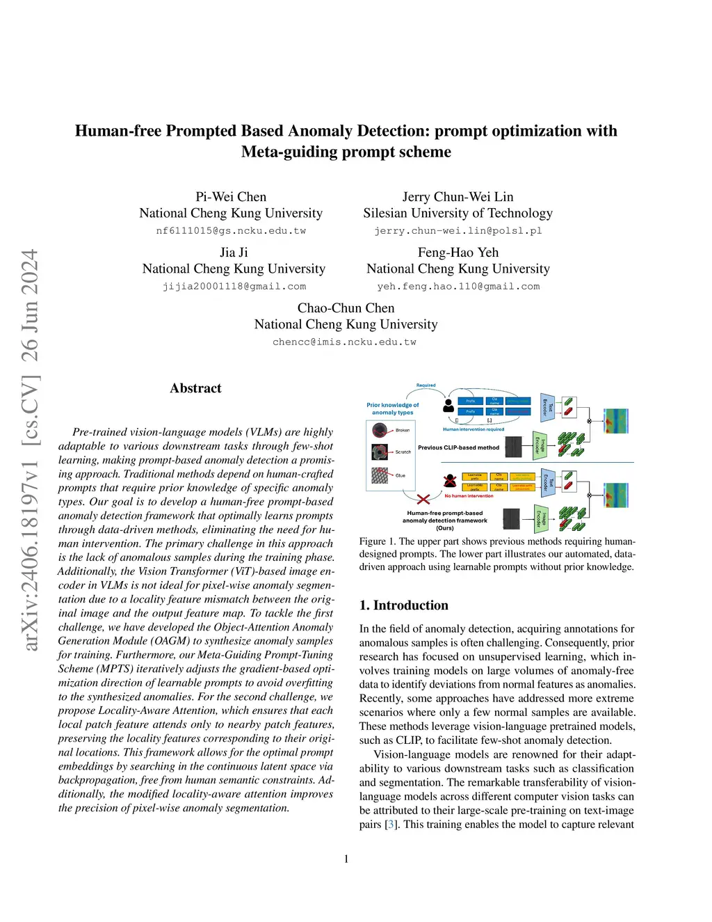 Pre-trained vision-language models (VLMs) are highly adaptable to various downstream tasks through few-shot learning, making prompt-based anomaly detection a promising approach. Traditional methods depend on human-crafted prompts that require prior knowledge of specific anomaly types. Our goal is to develop a human-free prompt-based anomaly detection framework that optimally learns prompts through data-driven methods, eliminating the need for human intervention. The primary challenge in this approach is the lack of anomalous samples during the training phase. Additionally, the Vision Transformer (ViT)-based image encoder in VLMs is not ideal for pixel-wise anomaly segmentation due to a locality feature mismatch between the original image and the output feature map. To tackle the first challenge, we have developed the Object-Attention Anomaly Generation Module (OAGM) to synthesize anomaly samples for training. Furthermore, our Meta-Guiding Prompt-Tuning Scheme (MPTS) iteratively adjusts the gradient-based optimization direction of learnable prompts to avoid overfitting to the synthesized anomalies. For the second challenge, we propose Locality-Aware Attention, which ensures that each local patch feature attends only to nearby patch features, preserving the locality features corresponding to their original locations. This framework allows for the optimal prompt embeddings by searching in the continuous latent space via backpropagation, free from human semantic constraints. Additionally, the modified locality-aware attention improves the precision of pixel-wise anomaly segmentation.
