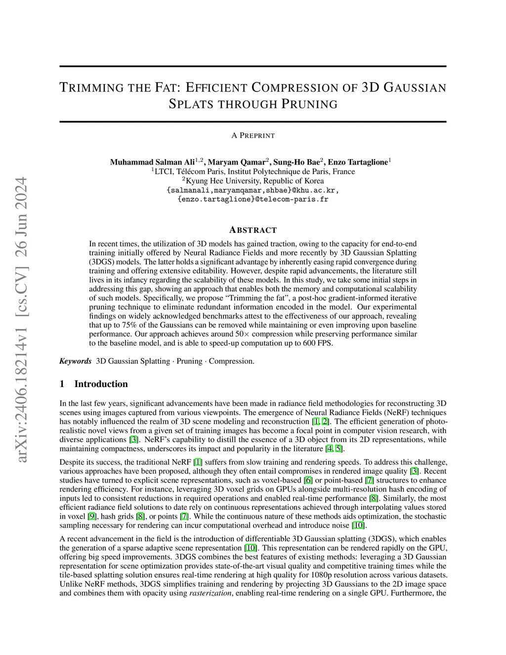 In recent times, the utilization of 3D models has gained traction, owing to the capacity for end-to-end training initially offered by Neural Radiance Fields and more recently by 3D Gaussian Splatting (3DGS) models. The latter holds a significant advantage by inherently easing rapid convergence during training and offering extensive editability. However, despite rapid advancements, the literature still lives in its infancy regarding the scalability of these models. In this study, we take some initial steps in addressing this gap, showing an approach that enables both the memory and computational scalability of such models. Specifically, we propose "Trimming the fat", a post-hoc gradient-informed iterative pruning technique to eliminate redundant information encoded in the model. Our experimental findings on widely acknowledged benchmarks attest to the effectiveness of our approach, revealing that up to 75% of the Gaussians can be removed while maintaining or even improving upon baseline performance. Our approach achieves around 50 compression while preserving performance similar to the baseline model, and is able to speed-up computation up to 600 FPS.