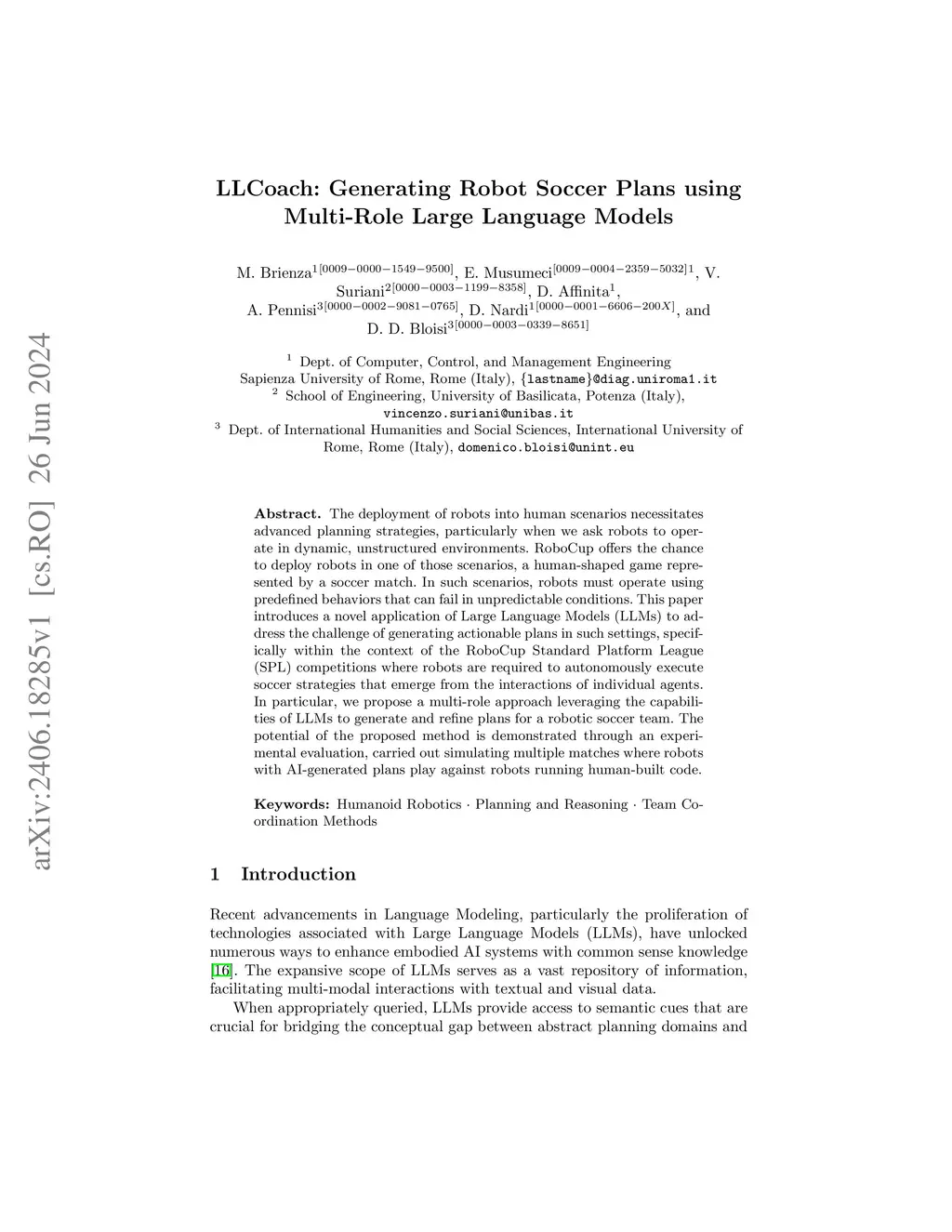 The deployment of robots into human scenarios necessitates advanced planning strategies, particularly when we ask robots to operate in dynamic, unstructured environments. RoboCup offers the chance to deploy robots in one of those scenarios, a human-shaped game represented by a soccer match. In such scenarios, robots must operate using predefined behaviors that can fail in unpredictable conditions. This paper introduces a novel application of Large Language Models (LLMs) to address the challenge of generating actionable plans in such settings, specifically within the context of the RoboCup Standard Platform League (SPL) competitions where robots are required to autonomously execute soccer strategies that emerge from the interactions of individual agents. In particular, we propose a multi-role approach leveraging the capabilities of LLMs to generate and refine plans for a robotic soccer team. The potential of the proposed method is demonstrated through an experimental evaluation,carried out simulating multiple matches where robots with AI-generated plans play against robots running human-built code.
