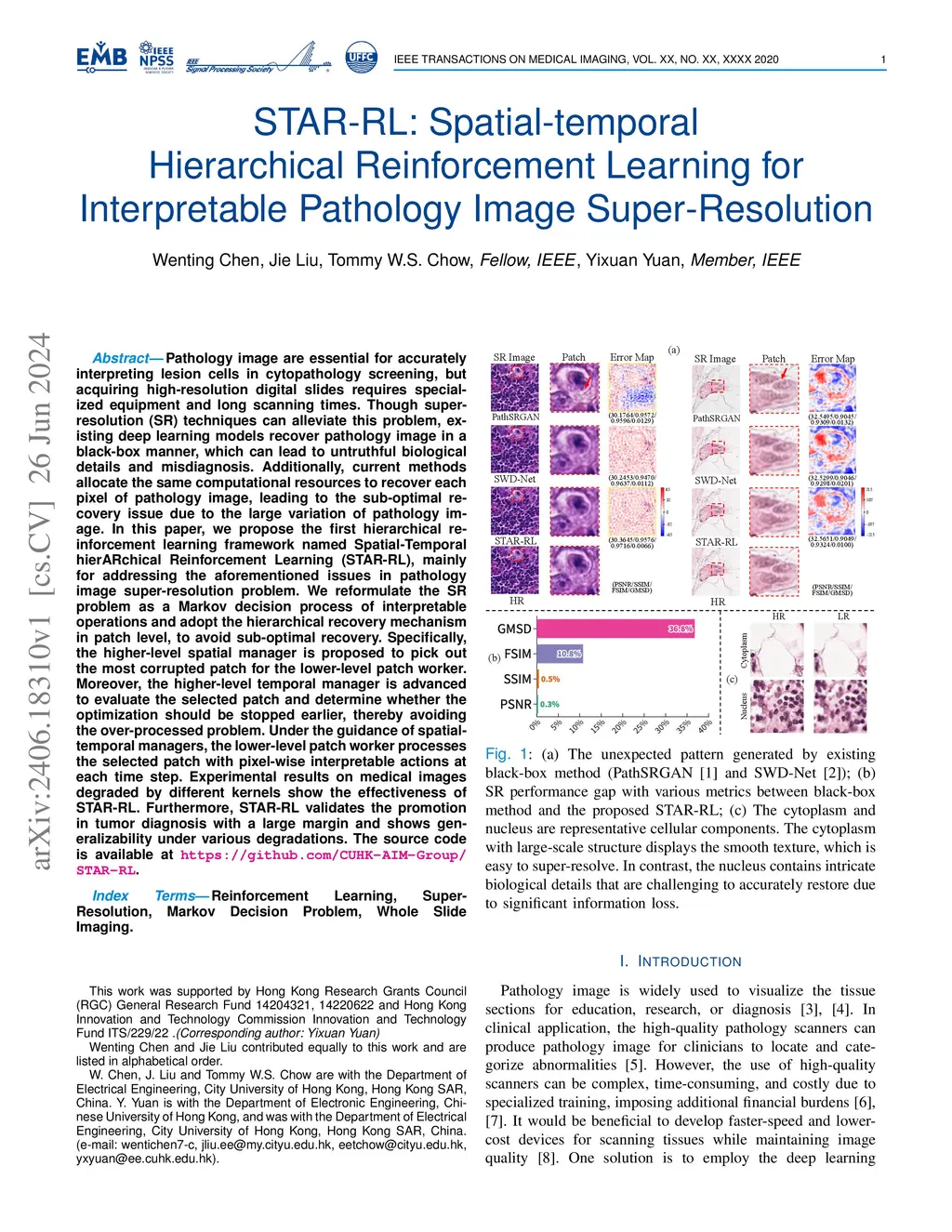 Pathology image are essential for accurately interpreting lesion cells in cytopathology screening, but acquiring high-resolution digital slides requires specialized equipment and long scanning times. Though super-resolution (SR) techniques can alleviate this problem, existing deep learning models recover pathology image in a black-box manner, which can lead to untruthful biological details and misdiagnosis. Additionally, current methods allocate the same computational resources to recover each pixel of pathology image, leading to the sub-optimal recovery issue due to the large variation of pathology image. In this paper, we propose the first hierarchical reinforcement learning framework named Spatial-Temporal hierARchical Reinforcement Learning (STAR-RL), mainly for addressing the aforementioned issues in pathology image super-resolution problem. We reformulate the SR problem as a Markov decision process of interpretable operations and adopt the hierarchical recovery mechanism in patch level, to avoid sub-optimal recovery. Specifically, the higher-level spatial manager is proposed to pick out the most corrupted patch for the lower-level patch worker. Moreover, the higher-level temporal manager is advanced to evaluate the selected patch and determine whether the optimization should be stopped earlier, thereby avoiding the over-processed problem. Under the guidance of spatial-temporal managers, the lower-level patch worker processes the selected patch with pixel-wise interpretable actions at each time step. Experimental results on medical images degraded by different kernels show the effectiveness of STAR-RL. Furthermore, STAR-RL validates the promotion in tumor diagnosis with a large margin and shows generalizability under various degradations. The source code is available at https://github.com/CUHK-AIM-Group/STAR-RL.