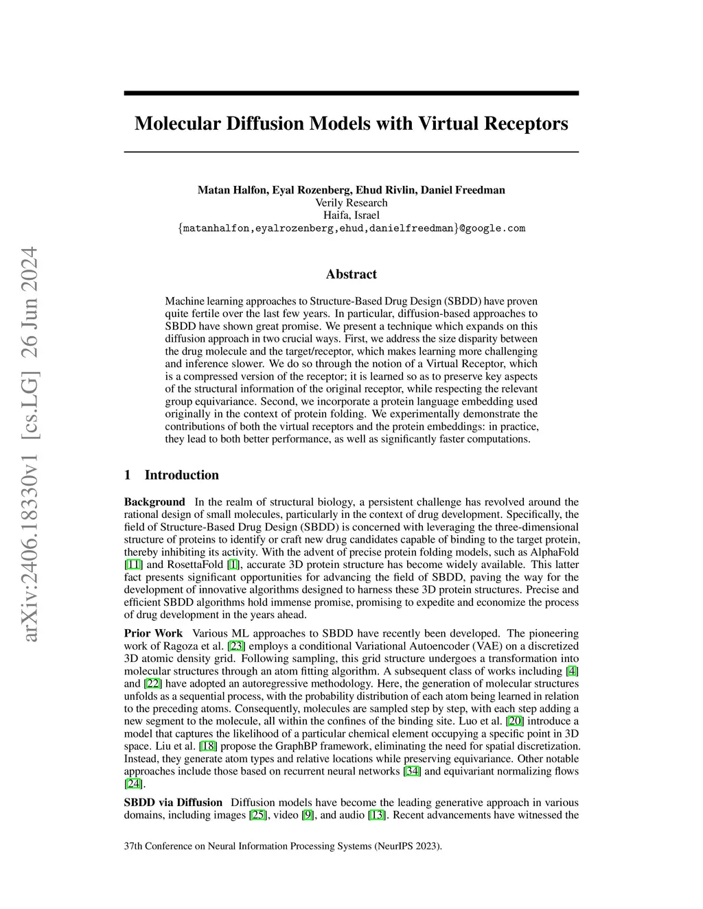 Machine learning approaches to Structure-Based Drug Design (SBDD) have proven quite fertile over the last few years. In particular, diffusion-based approaches to SBDD have shown great promise. We present a technique which expands on this diffusion approach in two crucial ways. First, we address the size disparity between the drug molecule and the target/receptor, which makes learning more challenging and inference slower. We do so through the notion of a Virtual Receptor, which is a compressed version of the receptor; it is learned so as to preserve key aspects of the structural information of the original receptor, while respecting the relevant group equivariance. Second, we incorporate a protein language embedding used originally in the context of protein folding. We experimentally demonstrate the contributions of both the virtual receptors and the protein embeddings: in practice, they lead to both better performance, as well as significantly faster computations.