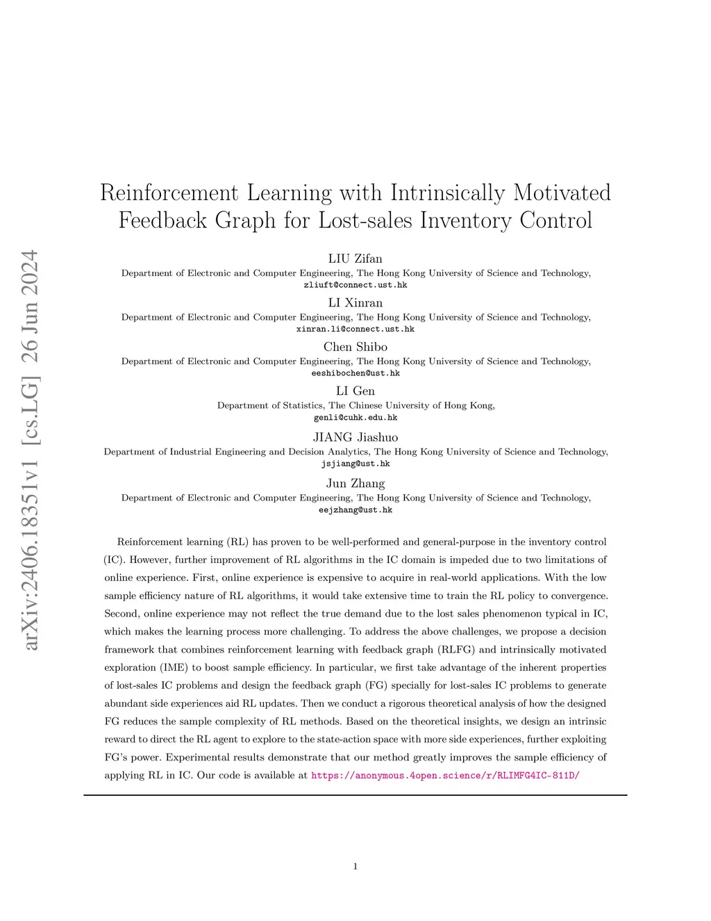Reinforcement Learning with Intrinsically Motivated Feedback Graph for Lost-sales Inventory Control