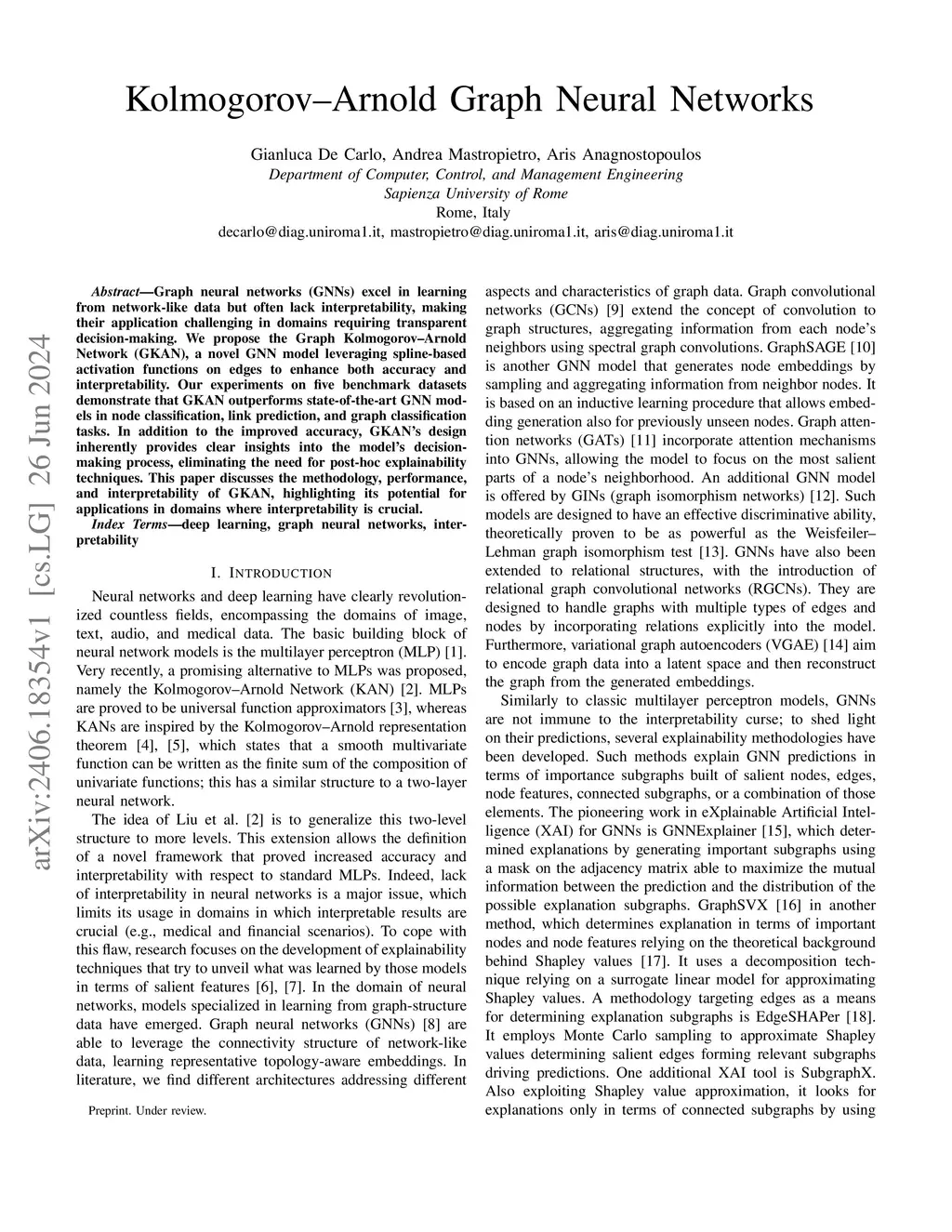 Graph neural networks (GNNs) excel in learning from network-like data but often lack interpretability, making their application challenging in domains requiring transparent decision-making. We propose the Graph Kolmogorov-Arnold Network (GKAN), a novel GNN model leveraging spline-based activation functions on edges to enhance both accuracy and interpretability. Our experiments on five benchmark datasets demonstrate that GKAN outperforms state-of-the-art GNN models in node classification, link prediction, and graph classification tasks. In addition to the improved accuracy, GKAN's design inherently provides clear insights into the model's decision-making process, eliminating the need for post-hoc explainability techniques. This paper discusses the methodology, performance, and interpretability of GKAN, highlighting its potential for applications in domains where interpretability is crucial.