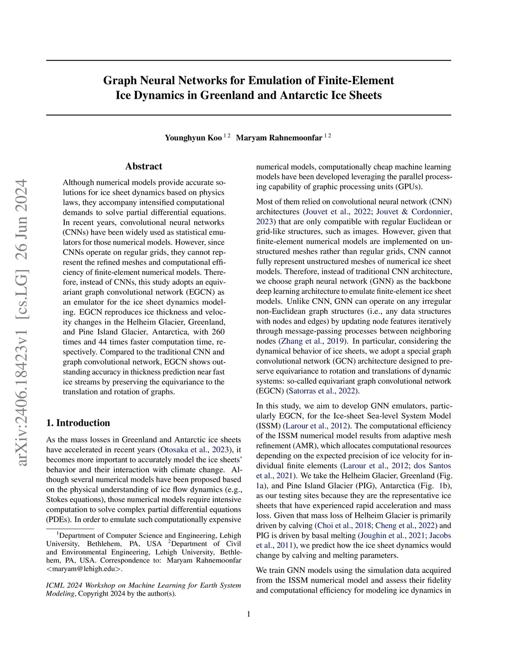 Although numerical models provide accurate solutions for ice sheet dynamics based on physics laws, they accompany intensified computational demands to solve partial differential equations. In recent years, convolutional neural networks (CNNs) have been widely used as statistical emulators for those numerical models. However, since CNNs operate on regular grids, they cannot represent the refined meshes and computational efficiency of finite-element numerical models. Therefore, instead of CNNs, this study adopts an equivariant graph convolutional network (EGCN) as an emulator for the ice sheet dynamics modeling. EGCN reproduces ice thickness and velocity changes in the Helheim Glacier, Greenland, and Pine Island Glacier, Antarctica, with 260 times and 44 times faster computation time, respectively. Compared to the traditional CNN and graph convolutional network, EGCN shows outstanding accuracy in thickness prediction near fast ice streams by preserving the equivariance to the translation and rotation of graphs.