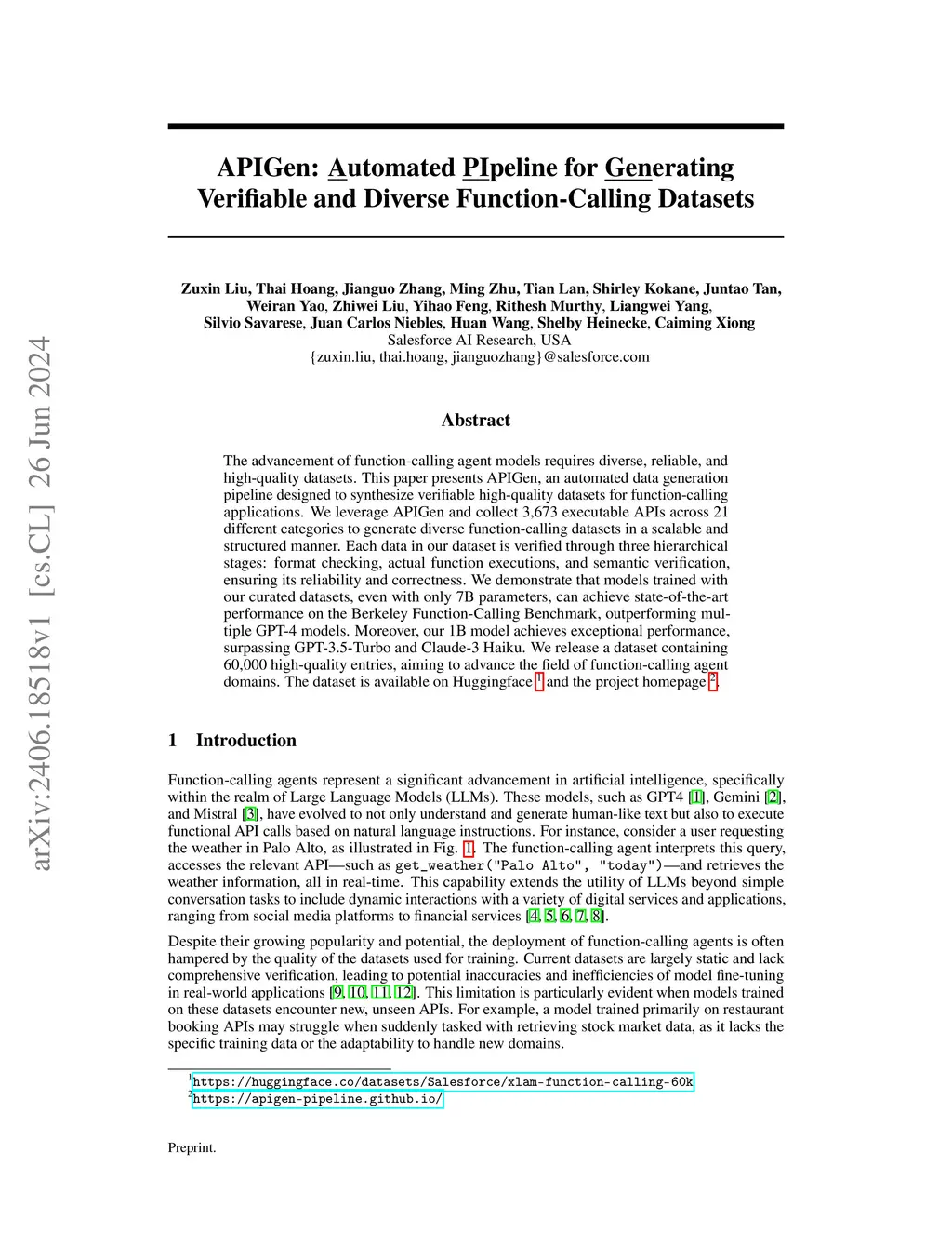 The advancement of function-calling agent models requires diverse, reliable, and high-quality datasets. This paper presents APIGen, an automated data generation pipeline designed to synthesize verifiable high-quality datasets for function-calling applications. We leverage APIGen and collect 3,673 executable APIs across 21 different categories to generate diverse function-calling datasets in a scalable and structured manner. Each data in our dataset is verified through three hierarchical stages: format checking, actual function executions, and semantic verification, ensuring its reliability and correctness. We demonstrate that models trained with our curated datasets, even with only 7B parameters, can achieve state-of-the-art performance on the Berkeley Function-Calling Benchmark, outperforming multiple GPT-4 models. Moreover, our 1B model achieves exceptional performance, surpassing GPT-3.5-Turbo and Claude-3 Haiku. We release a dataset containing 60,000 high-quality entries, aiming to advance the field of function-calling agent domains. The dataset is available on Huggingface: https://huggingface.co/datasets/Salesforce/xlam-function-calling-60k and the project homepage: https://apigen-pipeline.github.io/