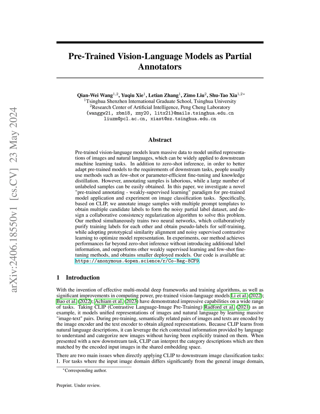 Pre-trained vision-language models learn massive data to model unified representations of images and natural languages, which can be widely applied to downstream machine learning tasks. In addition to zero-shot inference, in order to better adapt pre-trained models to the requirements of downstream tasks, people usually use methods such as few-shot or parameter-efficient fine-tuning and knowledge distillation. However, annotating samples is laborious, while a large number of unlabeled samples can be easily obtained. In this paper, we investigate a novel "pre-trained annotating - weakly-supervised learning" paradigm for pre-trained model application and experiment on image classification tasks. Specifically, based on CLIP, we annotate image samples with multiple prompt templates to obtain multiple candidate labels to form the noisy partial label dataset, and design a collaborative consistency regularization algorithm to solve this problem. Our method simultaneously trains two neural networks, which collaboratively purify training labels for each other and obtain pseudo-labels for self-training, while adopting prototypical similarity alignment and noisy supervised contrastive learning to optimize model representation. In experiments, our method achieves performances far beyond zero-shot inference without introducing additional label information, and outperforms other weakly supervised learning and few-shot fine-tuning methods, and obtains smaller deployed models. Our code is available at: \url{https://anonymous.4open.science/r/Co-Reg-8CF9}.